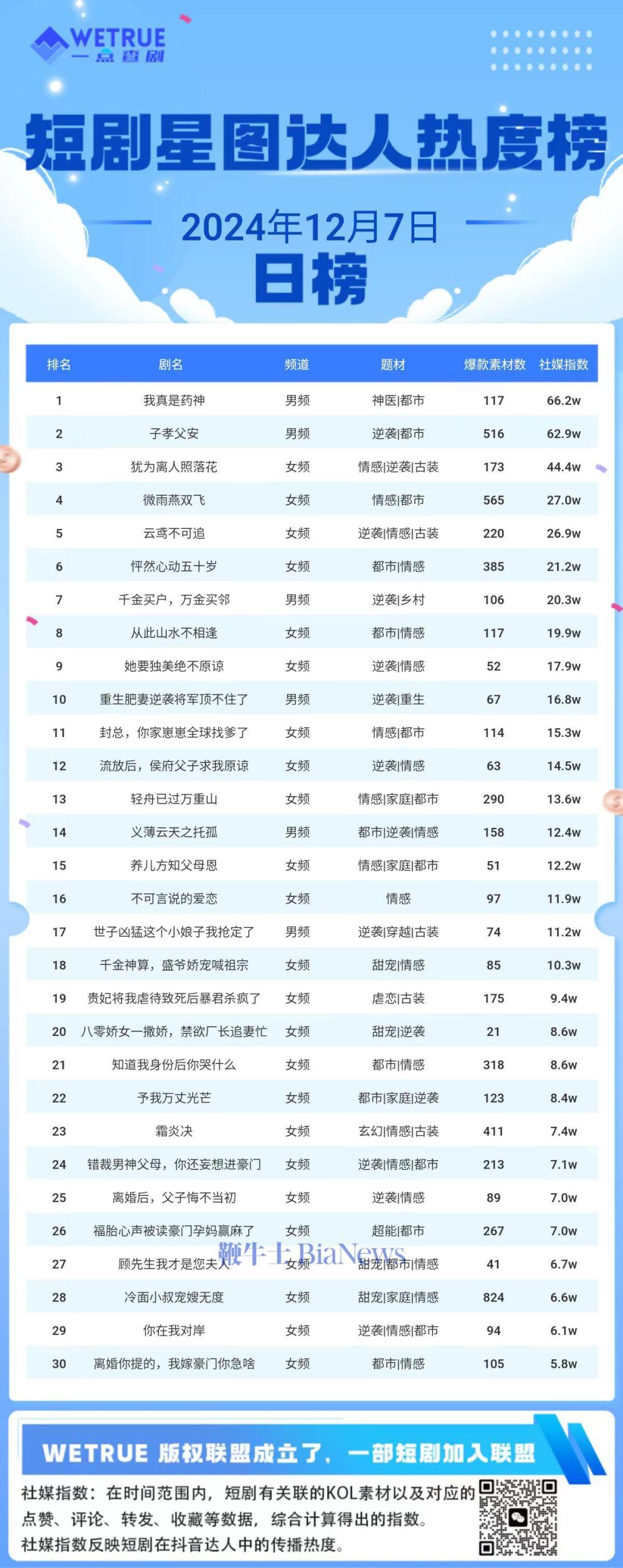 12月7日消息,为帮助短剧从业者提供更多信息,专注于短剧报道的新腕儿和科技媒体鞭牛士联合WETRUE短剧热度榜共同推出多种短剧热度榜。