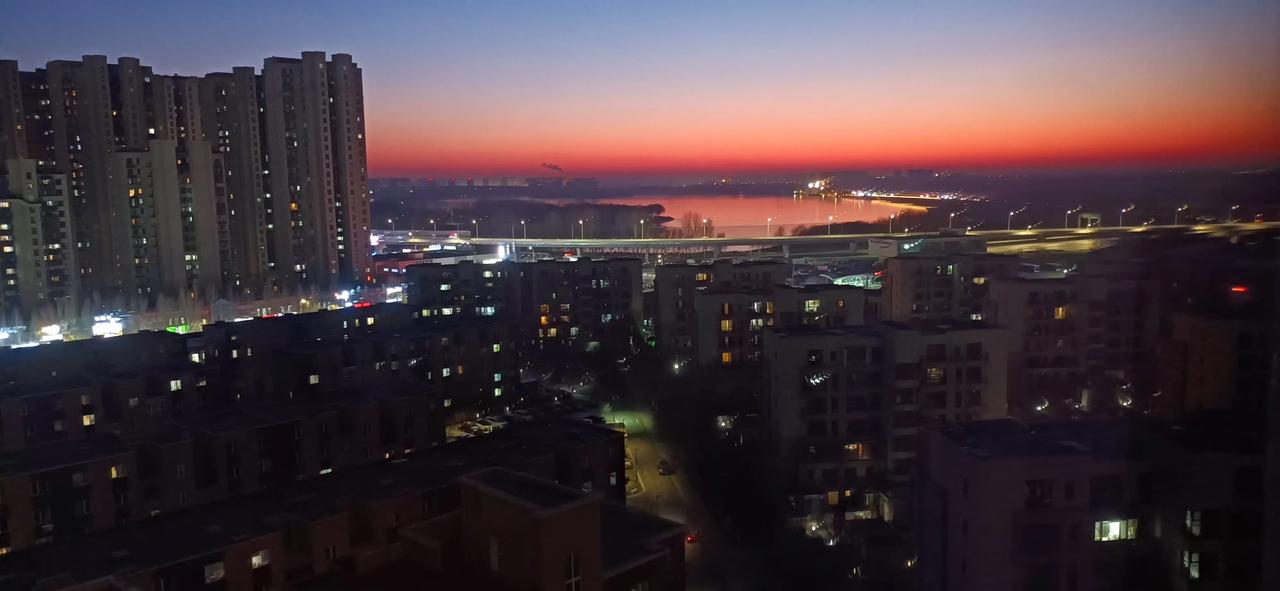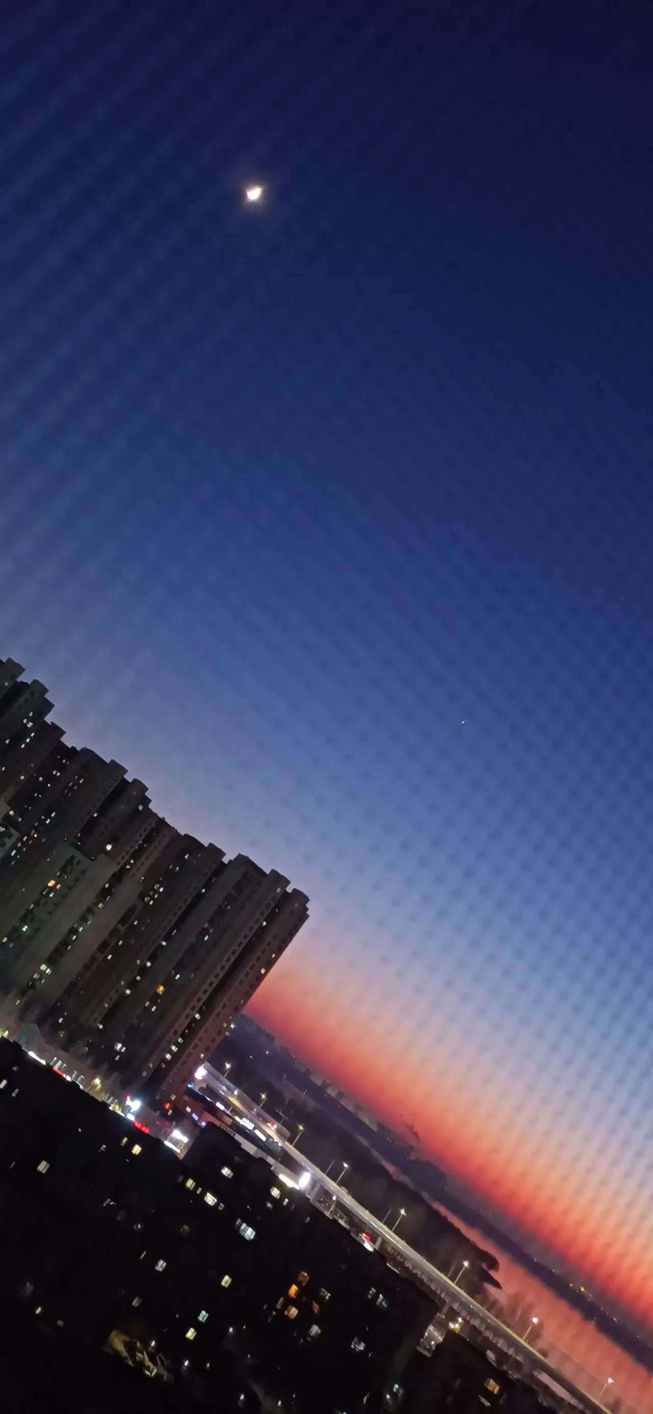 今天12月7号下午5点整,坐标沈阳丁香湖,也算是个奇景,落日余晖,月挂天际,车水马龙,万家灯火。