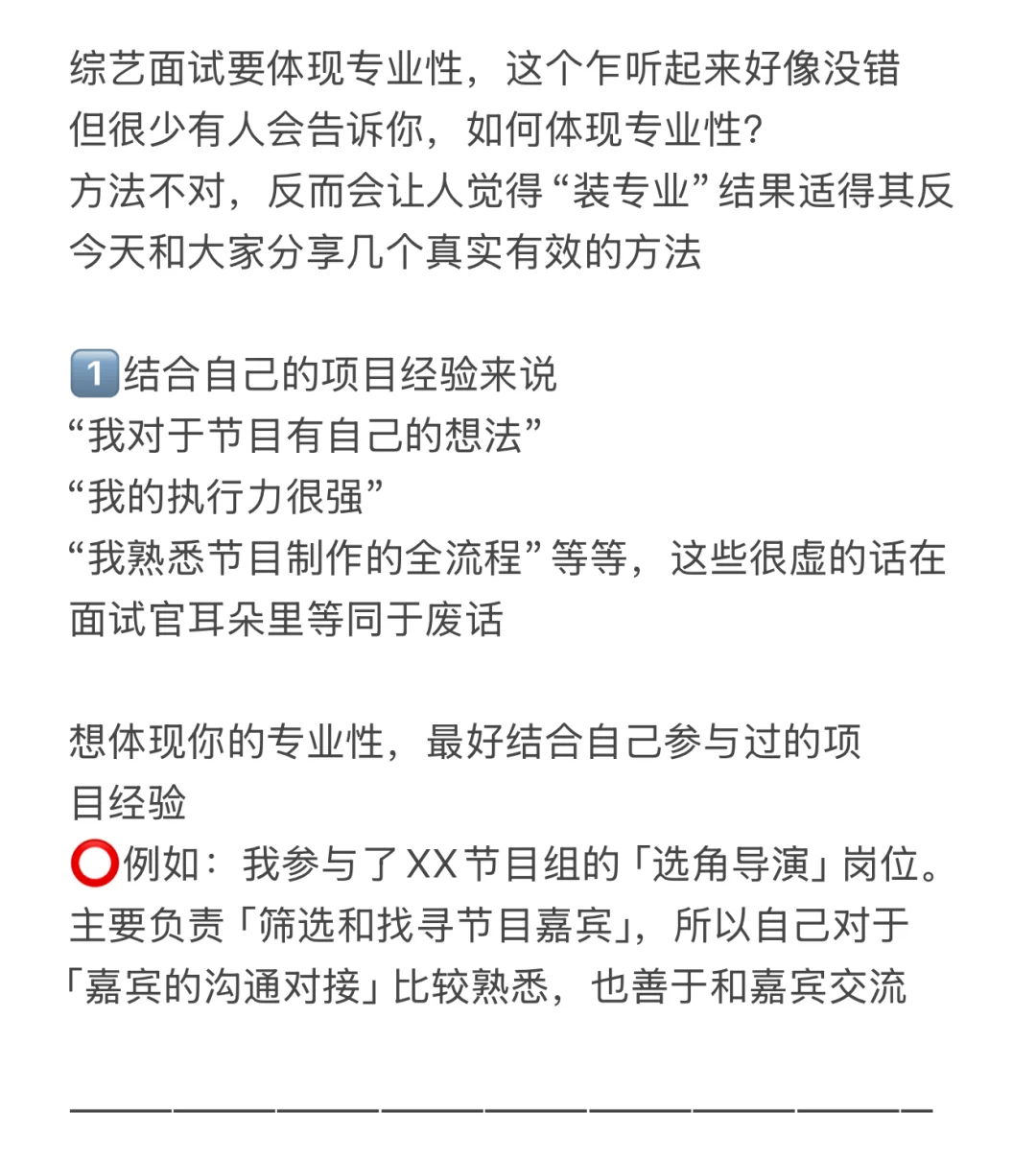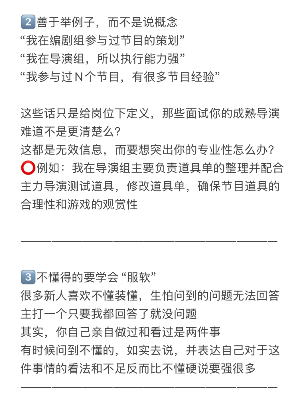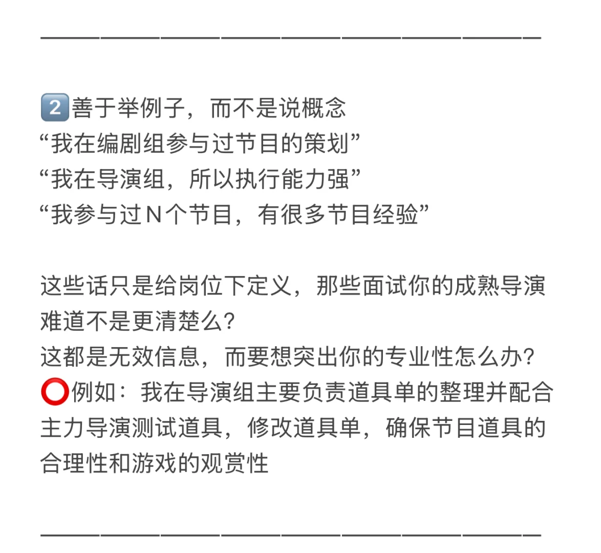 “我熟悉节目制作的全流程”等等,这些很虚的话在面试官耳朵里等同于废话