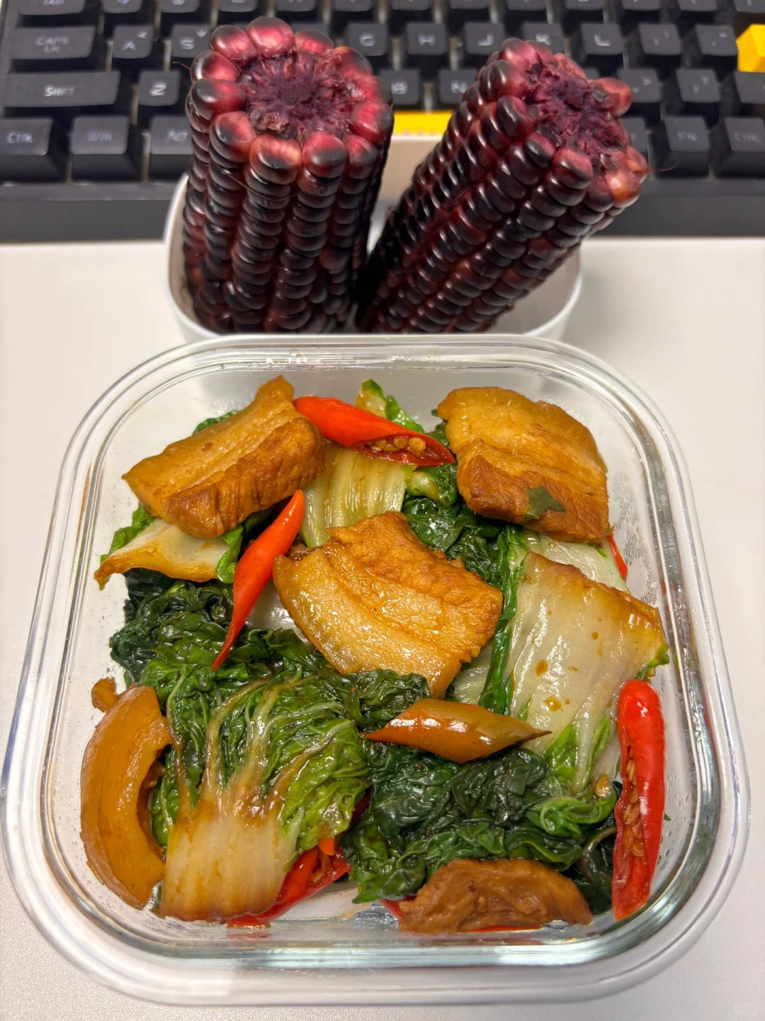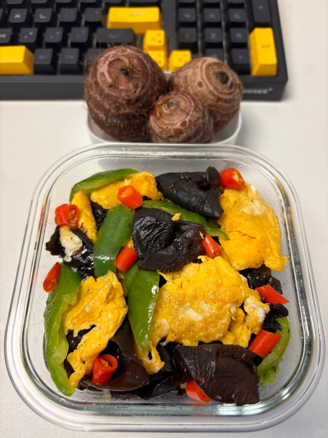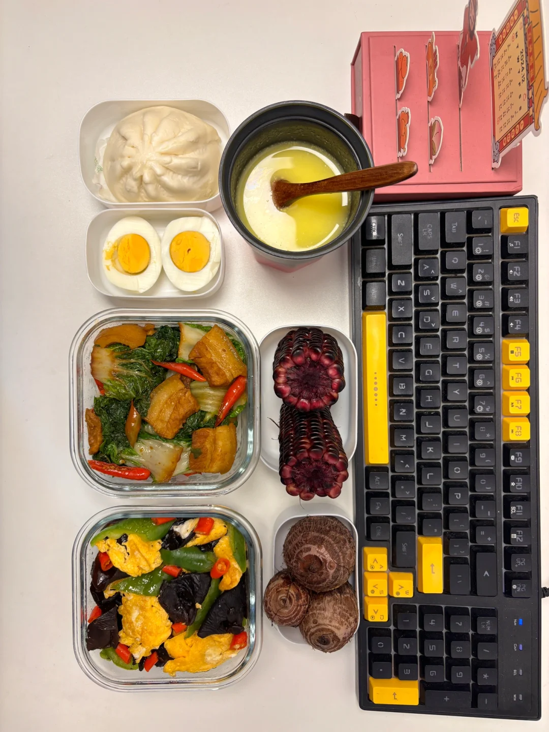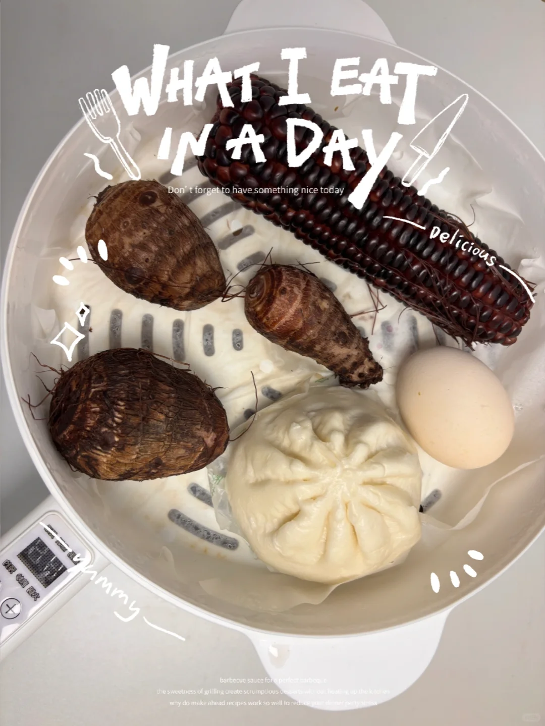 1⃣️早:包子、鸡蛋、玉米糊(2.2💰) 2⃣️中:菊花菜炒肉、黑玉米(5💰) 3⃣️晚:木耳炒鸡蛋、芋头(2.6💰) 猪肉菜市场买的约2💰 合计:9.8💰