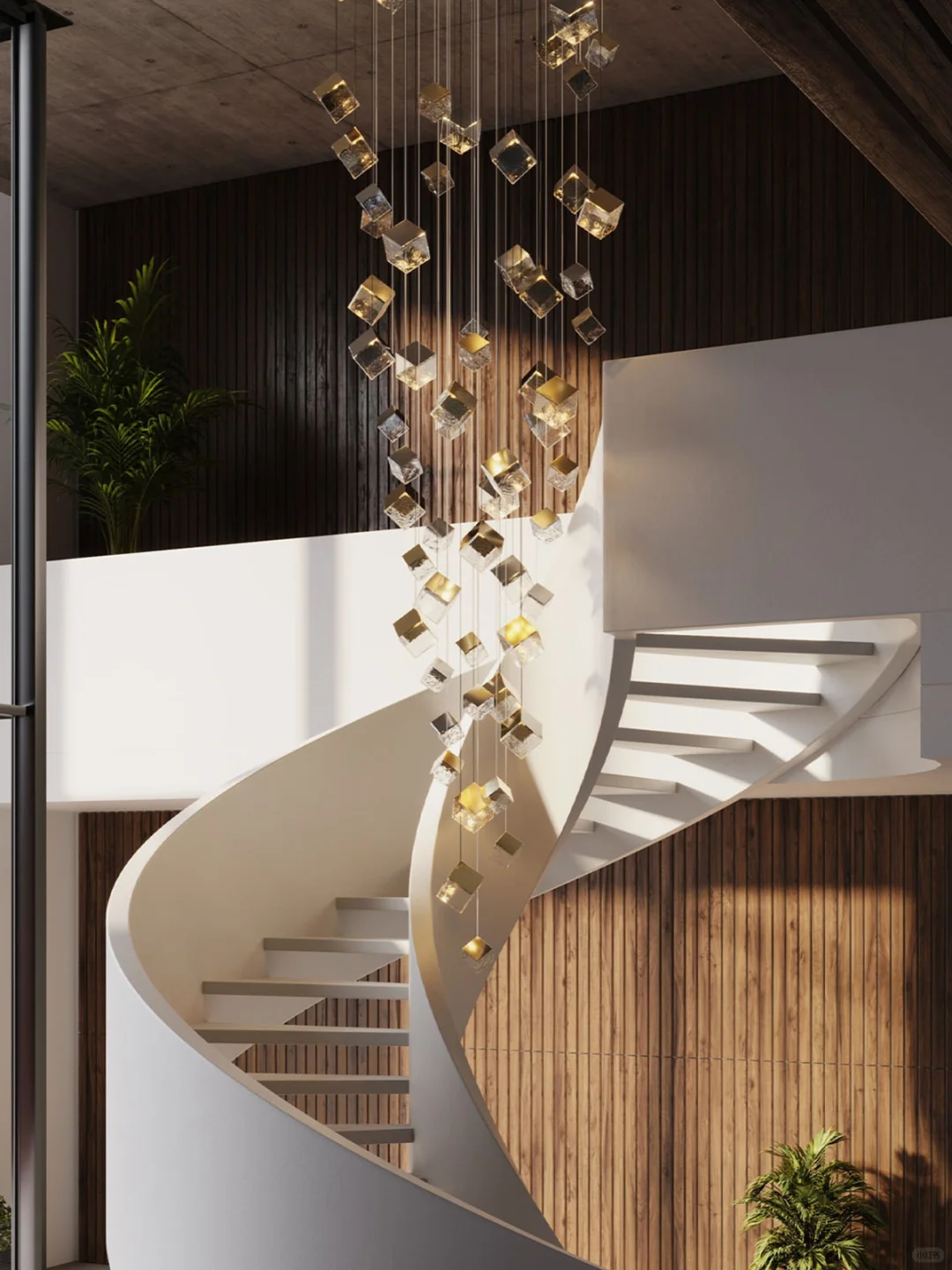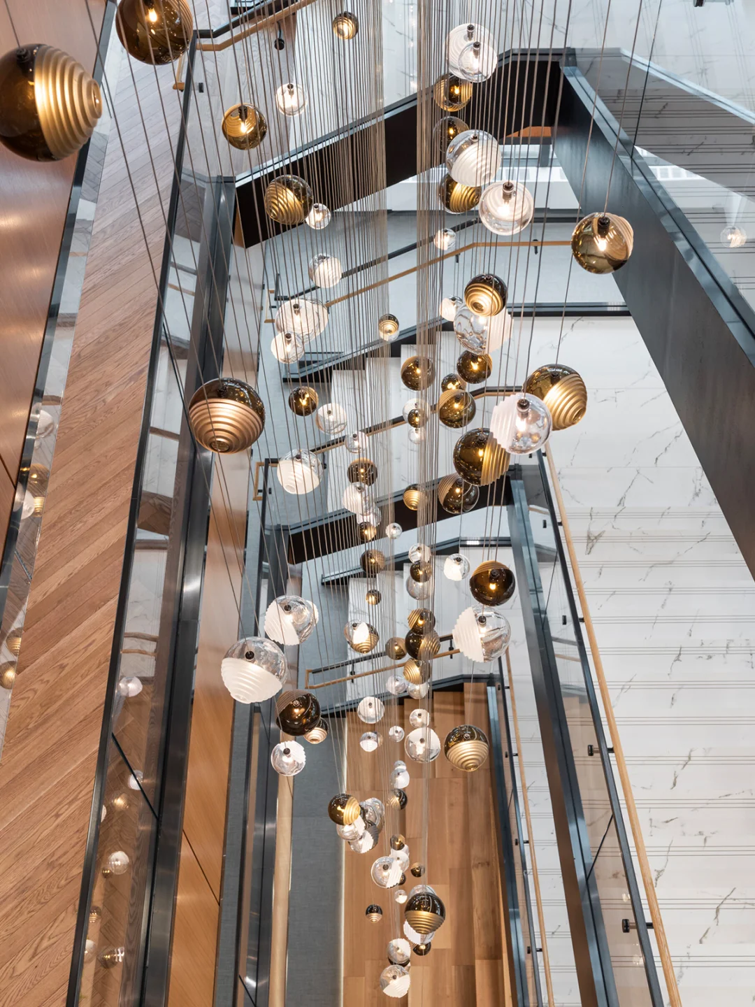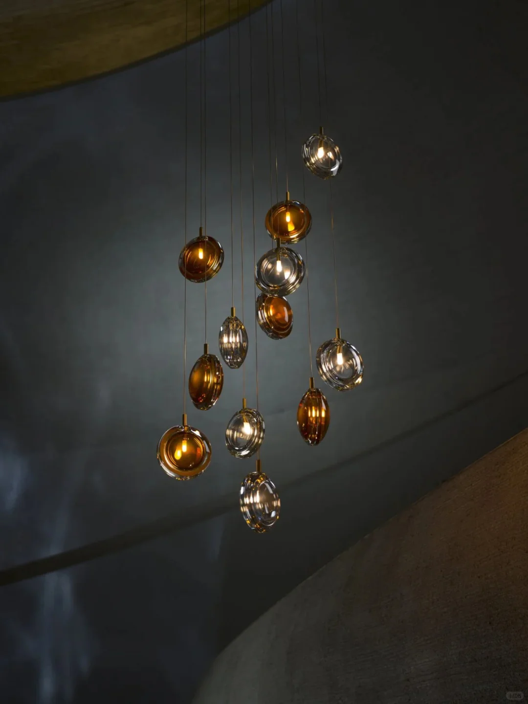 🔘楼梯井的多头吊灯提前设计好造型确认吊线高度。