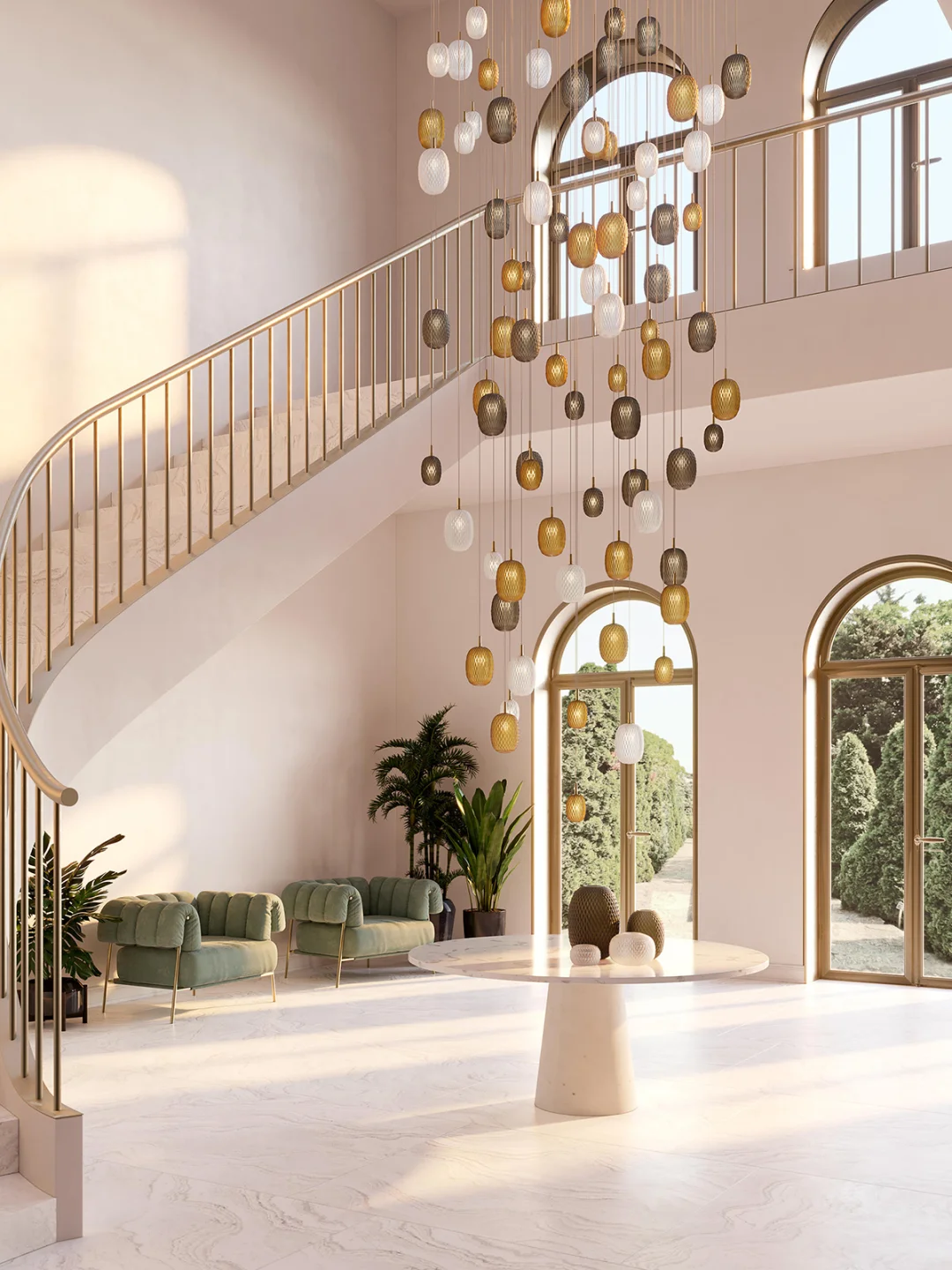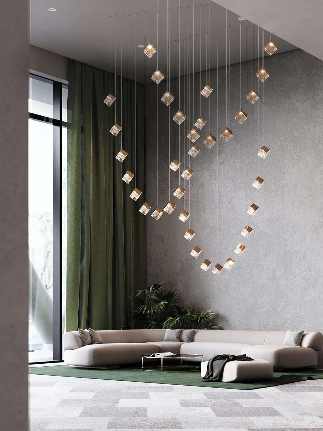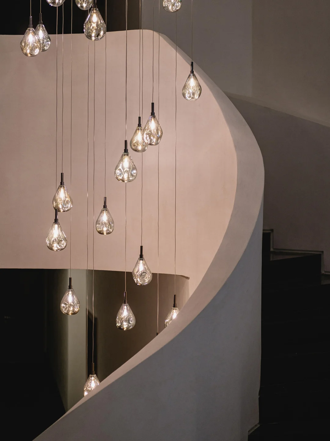 🔘楼梯井的多头吊灯提前设计好造型确认吊线高度。