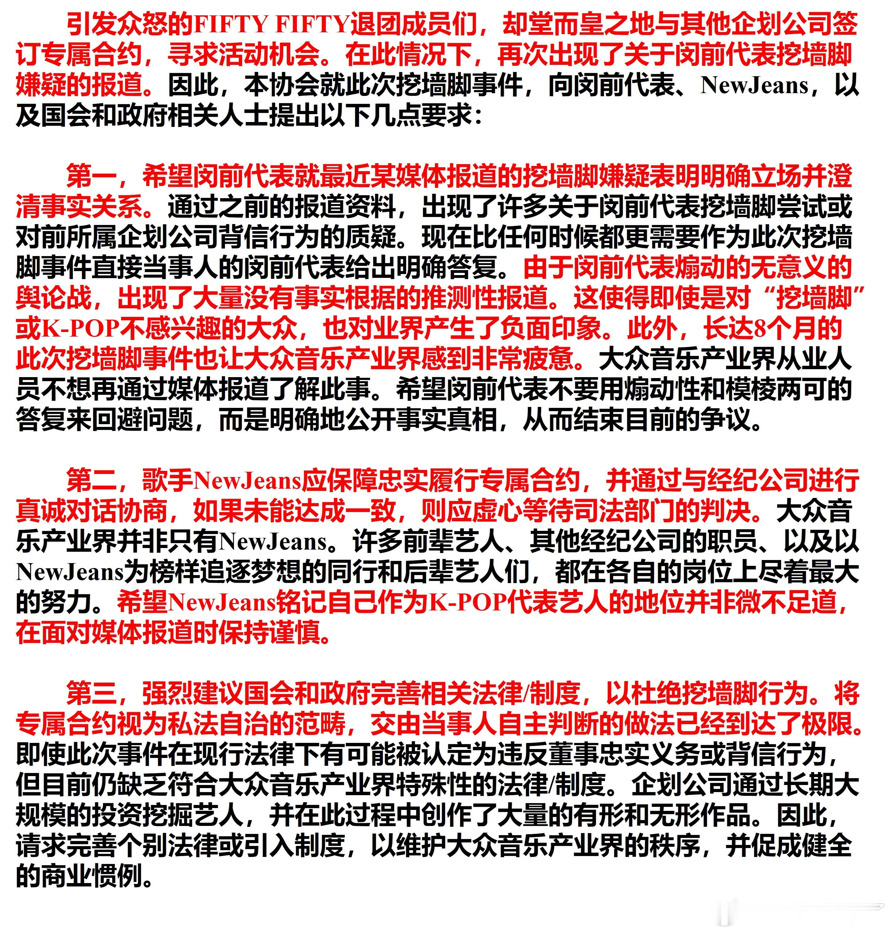 1,希望闵前代表就最近某媒体报道的挖墙脚嫌疑表明明确立场并澄清事实关系。