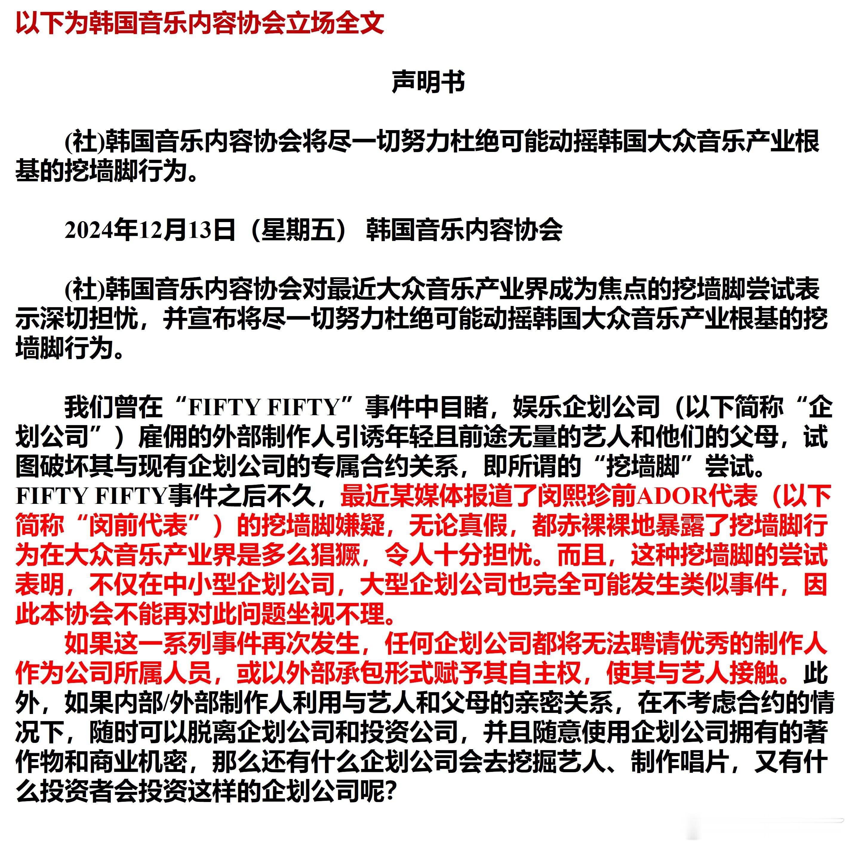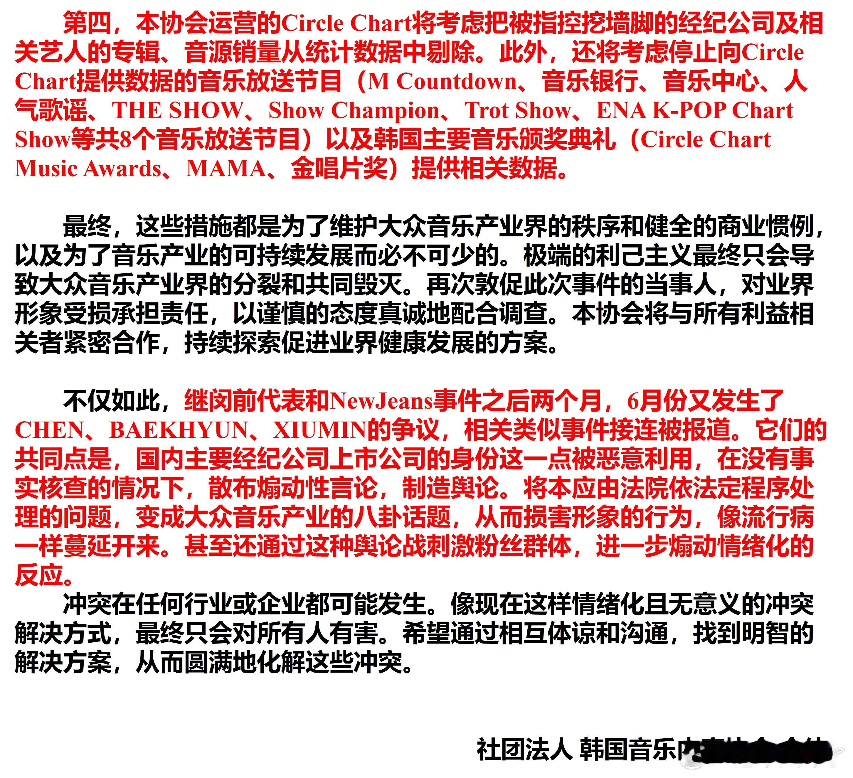 4,本协会运营的Circle Chart将考虑把被指控挖墙脚的经纪公司及相关艺人的专辑、音源销量从统计数据中剔除。此外,还将考虑停止向Circle Chart提供数据的音乐放送节目(M Countdown、音乐银行、音乐中心、人气歌谣、THE SHOW、Show Champion、Trot Show、ENA K-POP Chart Show等共8个音乐放送节目)以及韩国主要音乐颁奖典礼(Circle Chart Music Awards、MAMA、金唱片奖)提供相关数据。