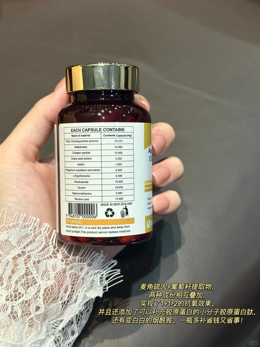 我现在一直在吃的麦角硫因是Care Magic时光瓶,刚开始是一天一粒慢慢进阶到每天2粒。它里面除了可以抗氧化线粒体防衰的麦角硫因外,还复配了葡萄籽提取物,它是目前发现的植物来源最高效的抗氧化剂之一,其抗氧化效果是维生素C和维生素E的30~50倍,麦角硫因+葡萄籽提取物,两种成份相互叠加,实现了1+1>2的抗氧效果。并且还添加了可以补充胶原蛋白的小分子胶原蛋白肽,还有变白白的烟酰胺。一瓶多补省钱又省事!