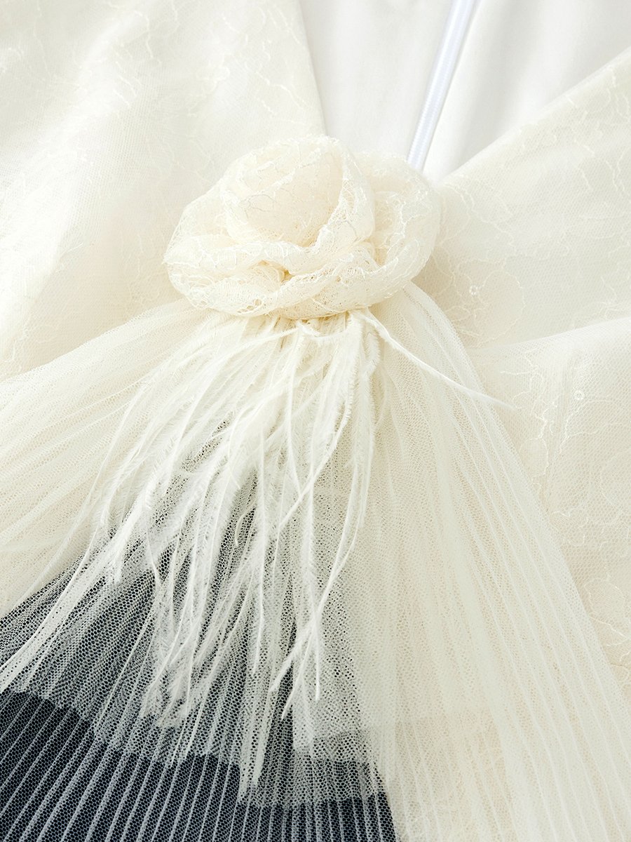 V领设计修饰脸型展现颈部线条 可拆卸羽毛网纱花花胸针典雅复古