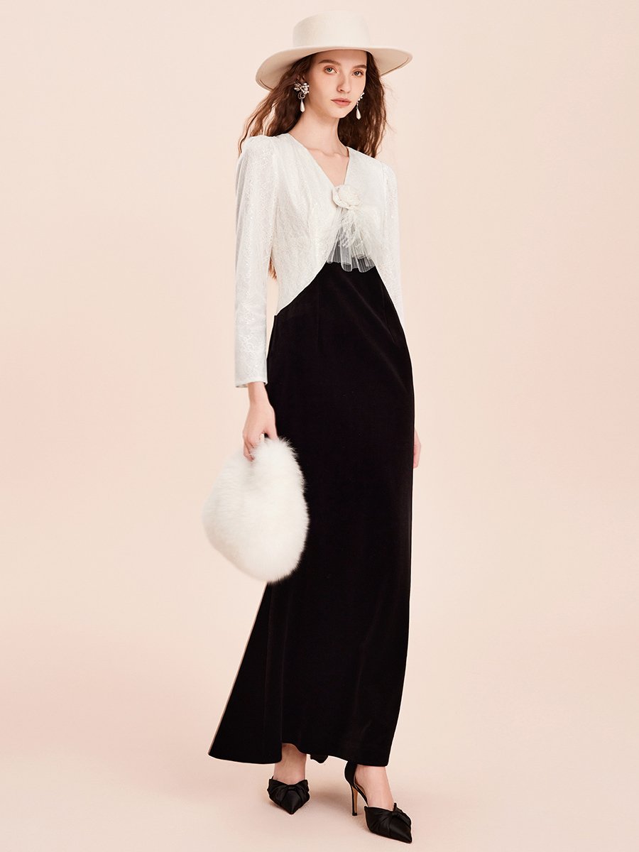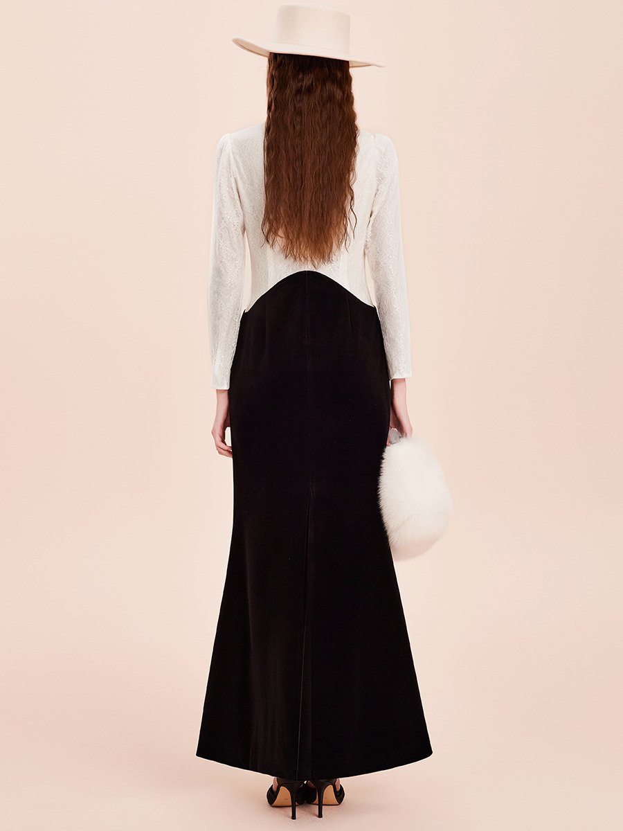 丝绒拼接蕾丝鱼尾裙连衣裙