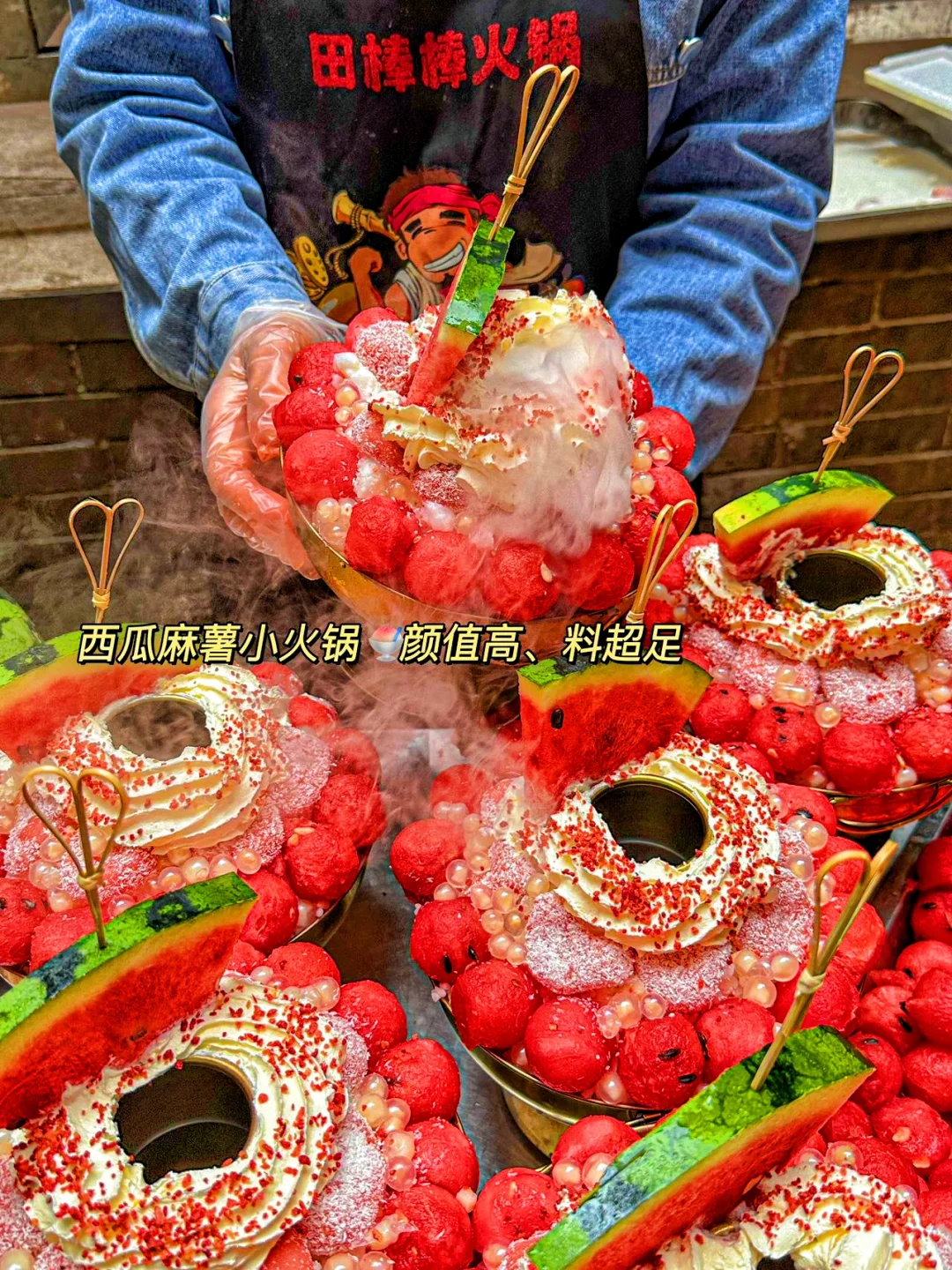 ✔️西瓜麻薯小火锅:颜值高,料也很足!饭后吃起来冰冰凉凉,解辣过瘾