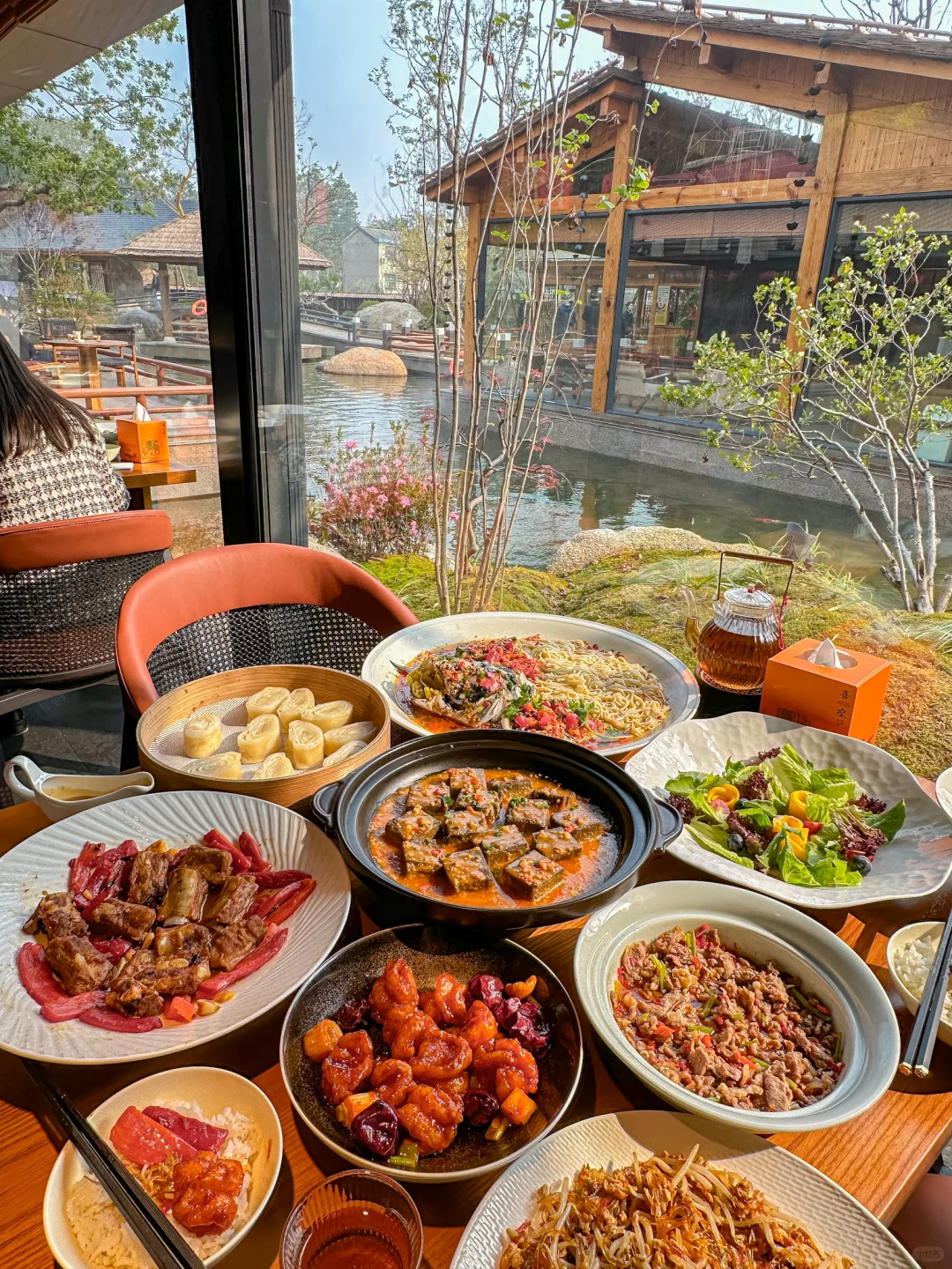 感谢长沙本地人的推荐啊!!没想到长沙还有这么美的地方🥹🥹!!像在苏州似的… 从进门开始就被震撼!!依山伴水,🌳层林叠翠的真的太美了!!湖泊 小溪 竹林 庭院..一步一景!!每个角落都透露着诗情画意~ 文字都难以形容在这个地方吃饭有多惬意啊😭!! 宫保虾球 泉水黑豆腐 红椒烧排骨 剁椒鱼头…点的每个菜口味都不错!!全桌吃的都很满意!! 还有古装小姐姐弹古筝!围炉煮茶🍵!吃完还可以逛逛“湖湘风土博物馆”!!真心建议:来长沙一定要来这里逛逛… (📍喜座·湖南美食村落)!!