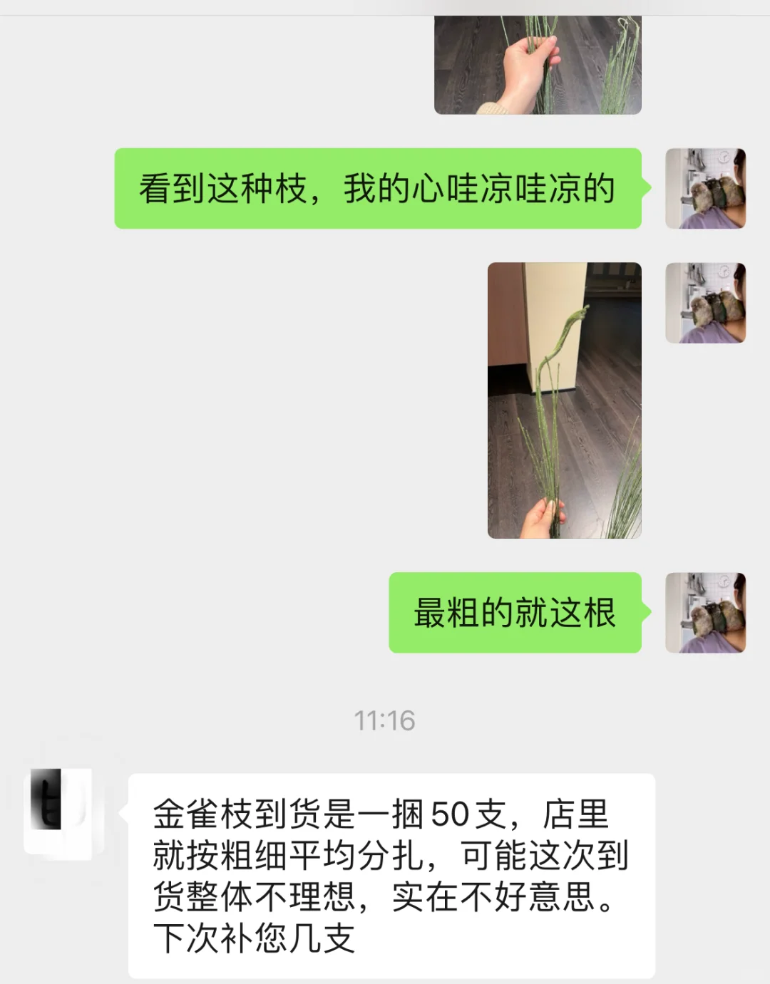 联系商家,还说下次给我补,没有下次了。但凡我买前给我说一声枝条会这么细,我都会考虑要不要买这么贵且如此拉跨的枝条。