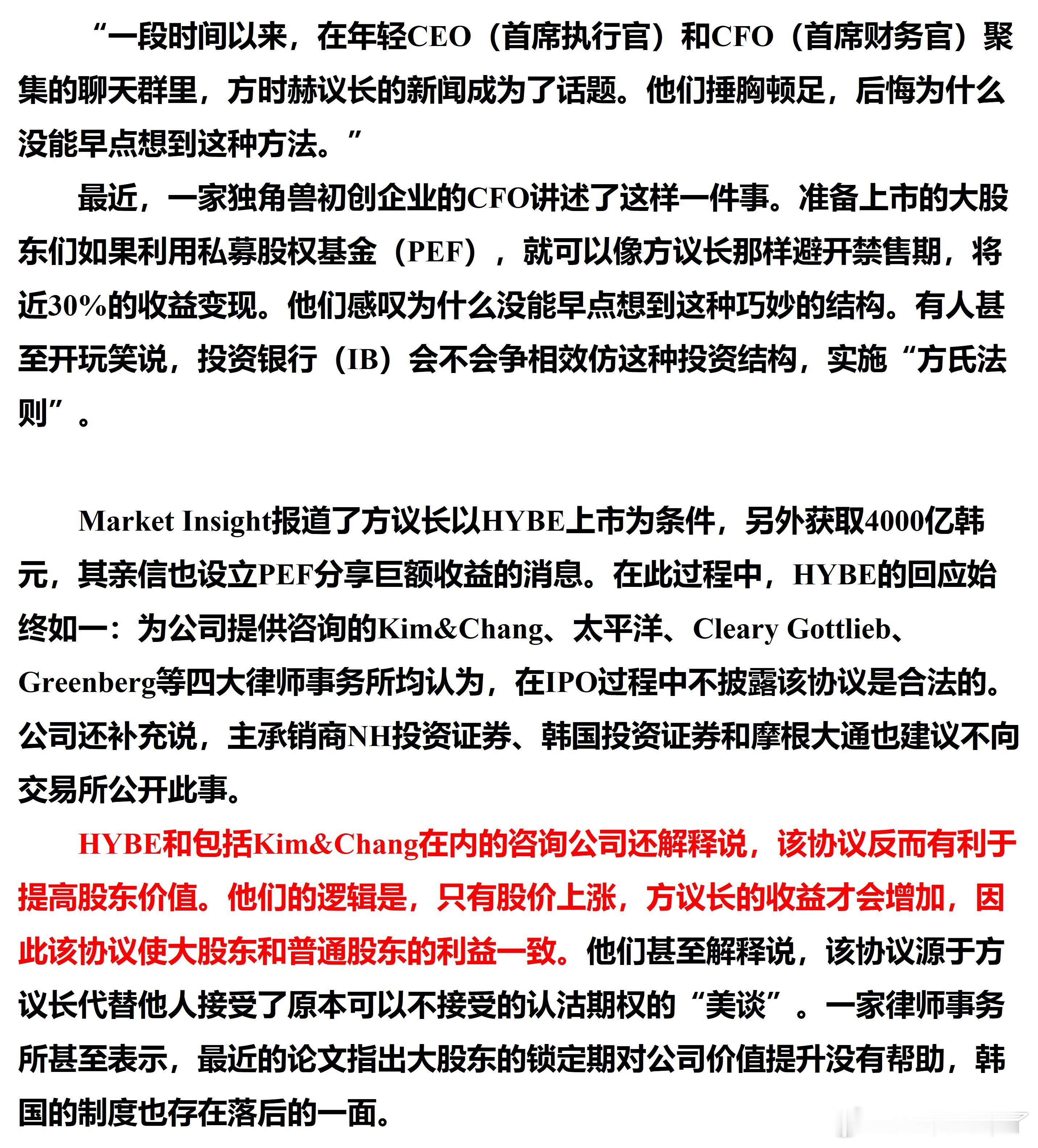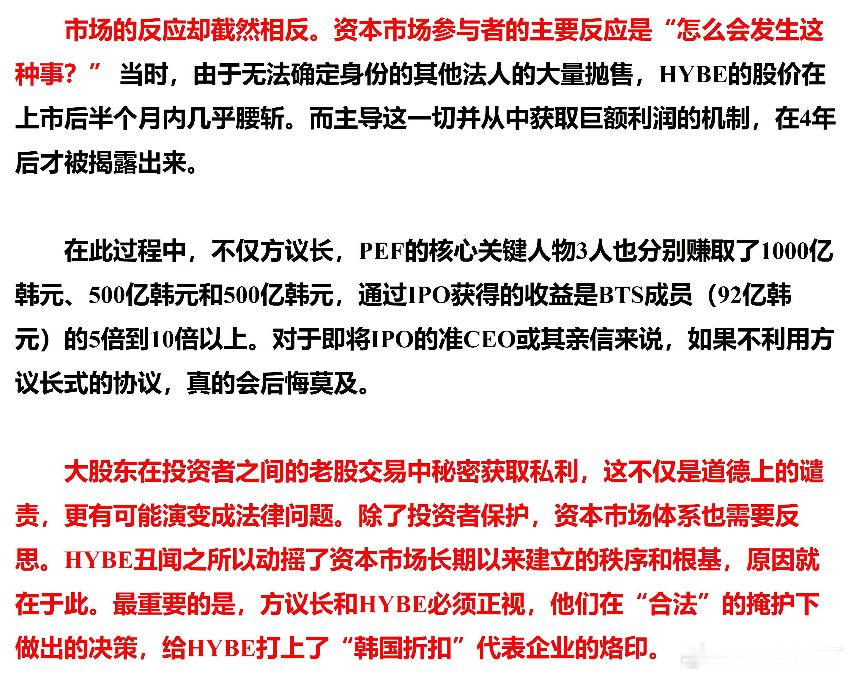 2,HYBE方面的辩称:只有股价上涨,方议长的收益才会增加,因此该协议使大股东和普通股东的利益一致(虽然事实是HYBE的股价在上市后半个月内几乎腰斩)