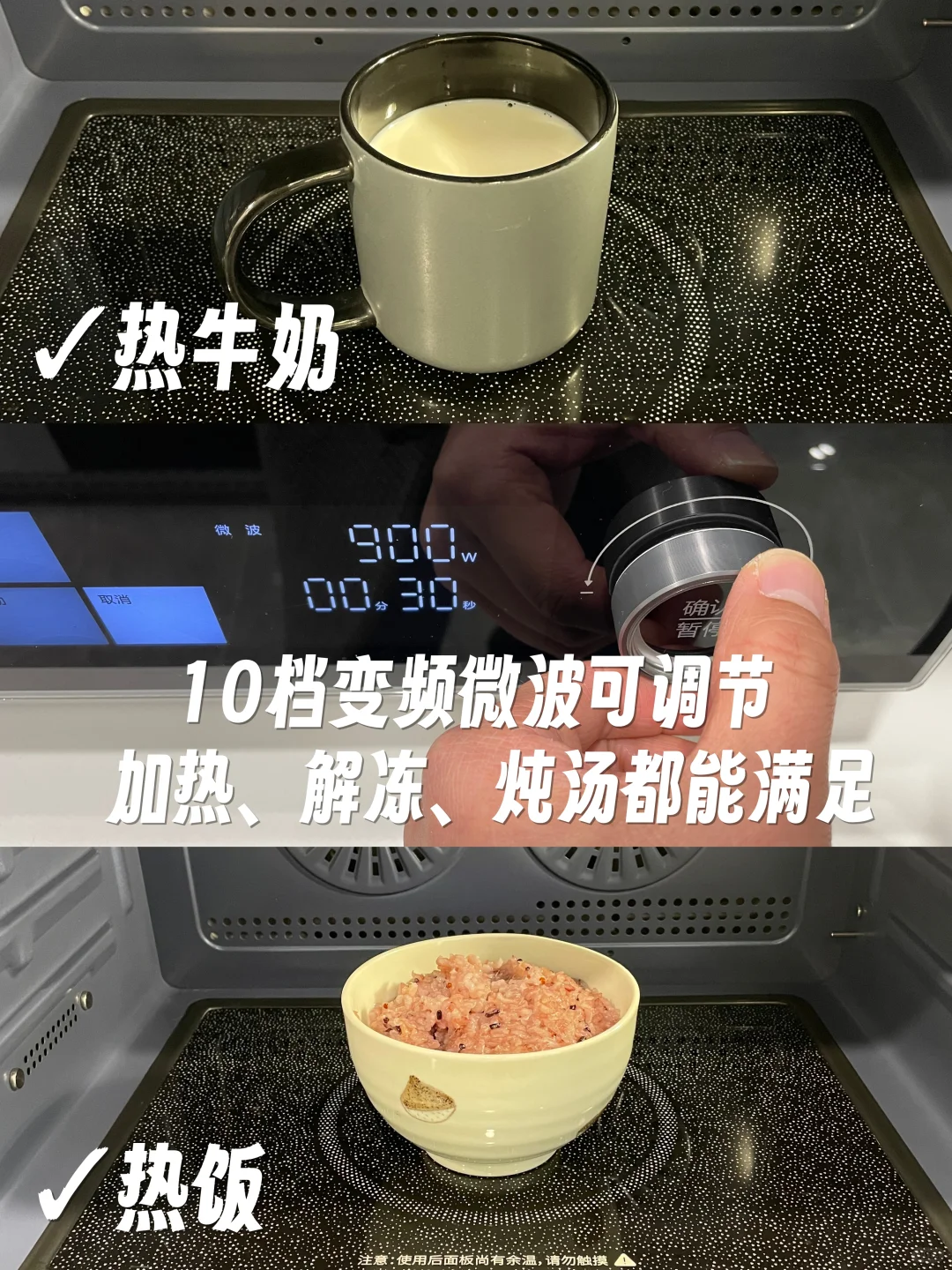 支持100-1000W十档变频微波调节,不同的食材解冻、翻热使用不同档位,加热、解冻、炖汤都很方便。