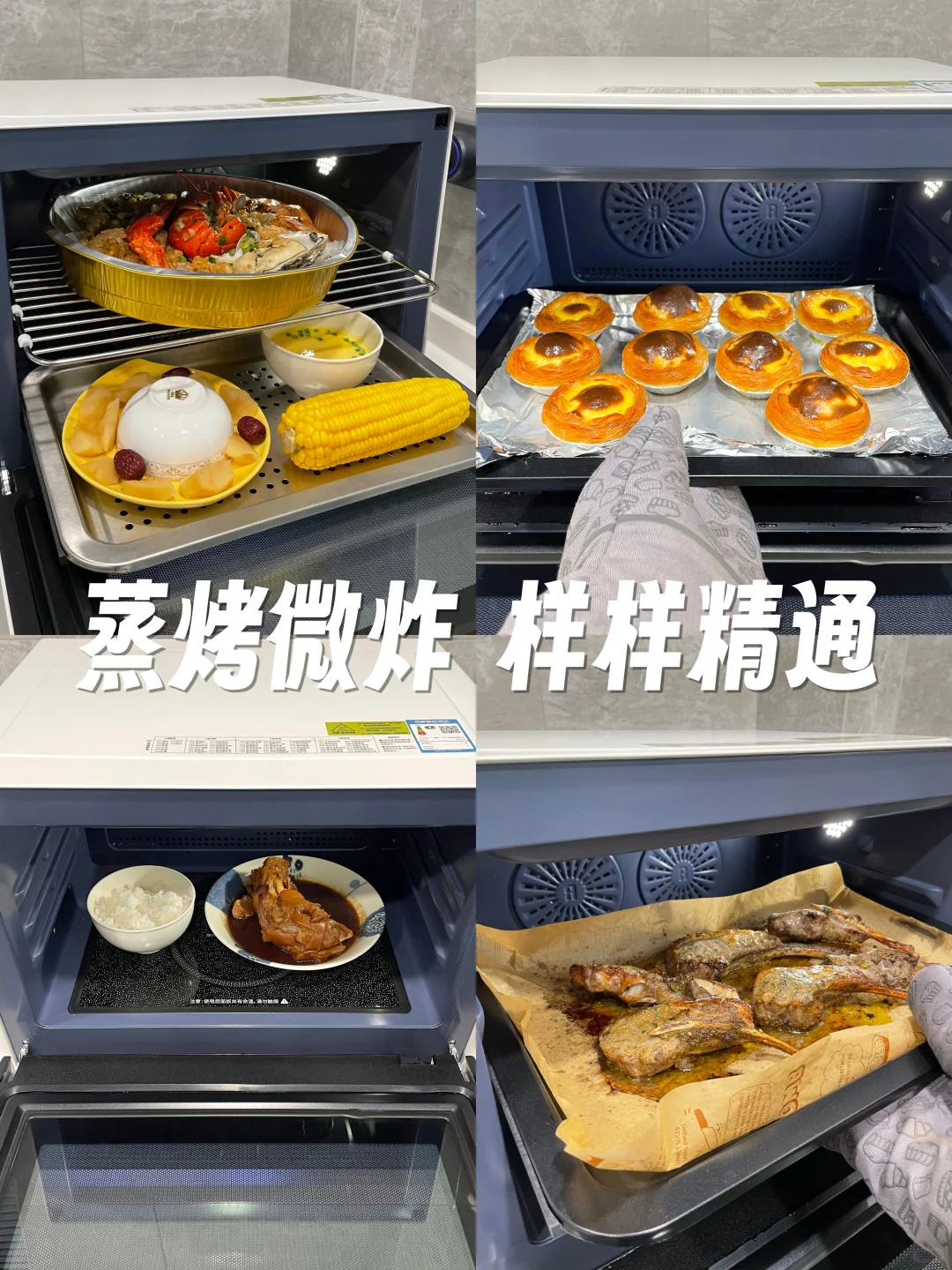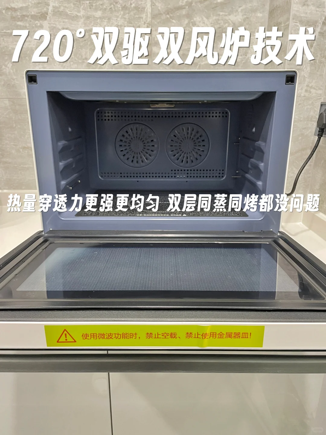 32L大容量满足一大家人的饮食需求,只占一小块空间,就把微波炉、蒸箱、空气炸锅、烤箱的功能都集中在了一起,蕞让我惊喜的是它的双驱双风炉技术,720°双驱热风带动蒸汽、热量高速循环,比普通单风机微蒸烤箱升温更快,食物受热更均匀,在这个技术加持下,各个模式表现都不输单功能电器: