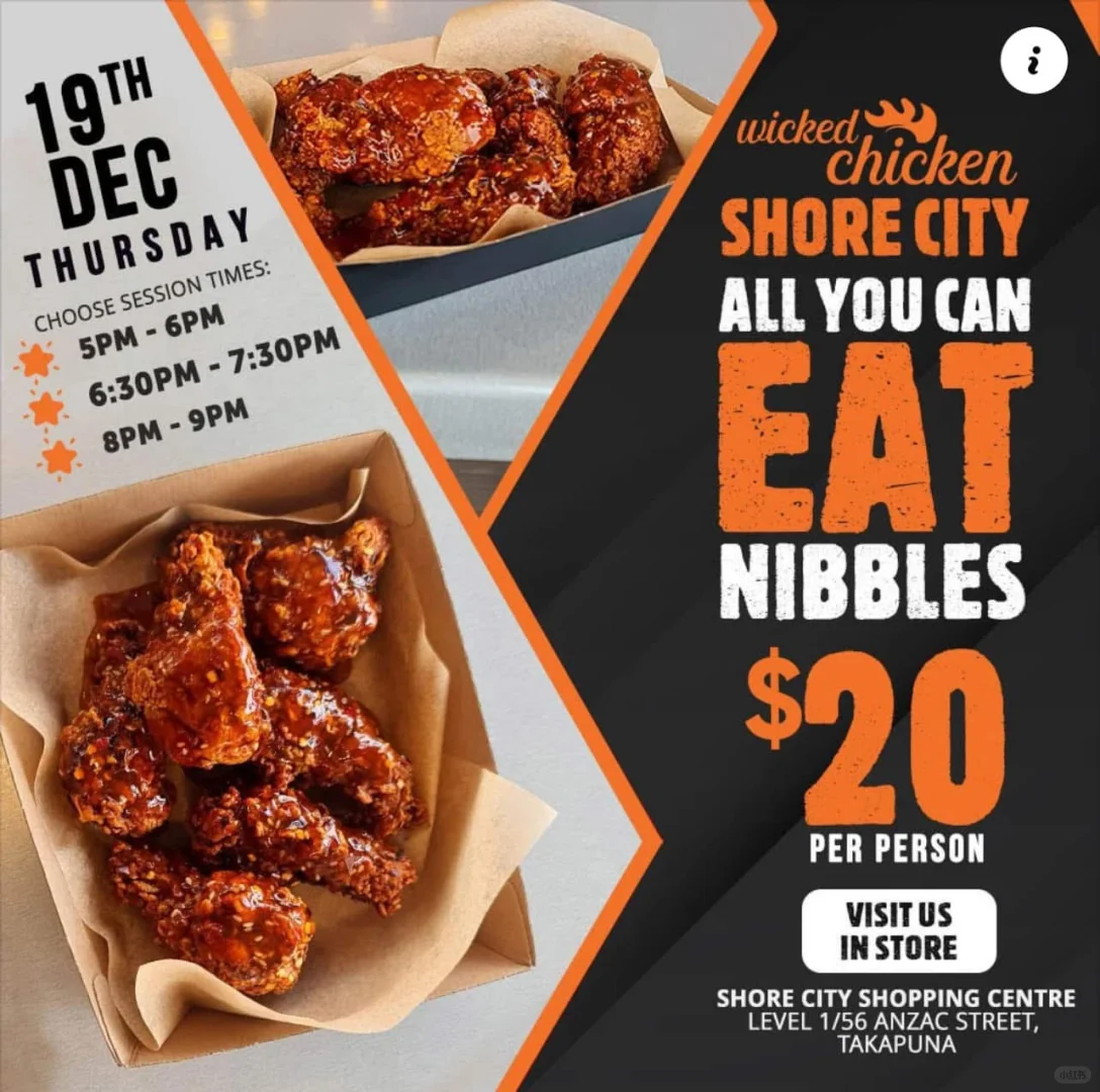 Wicked Chicken Shore City推出了💰20随意吃炸鸡的活动![哇R][哇R]对于炸鸡星人来说这个活动不要太合适了[得意R] 就在12 月 19 日,仅此一天,可以尽情享受无限量炸鸡翅盛宴! 有三个时段可供选择,记得提前预定[赞R] 📍Wicked Shore City 1/56 Anzac Street, Takapuna, Auckland 关注我,下一篇更精彩
