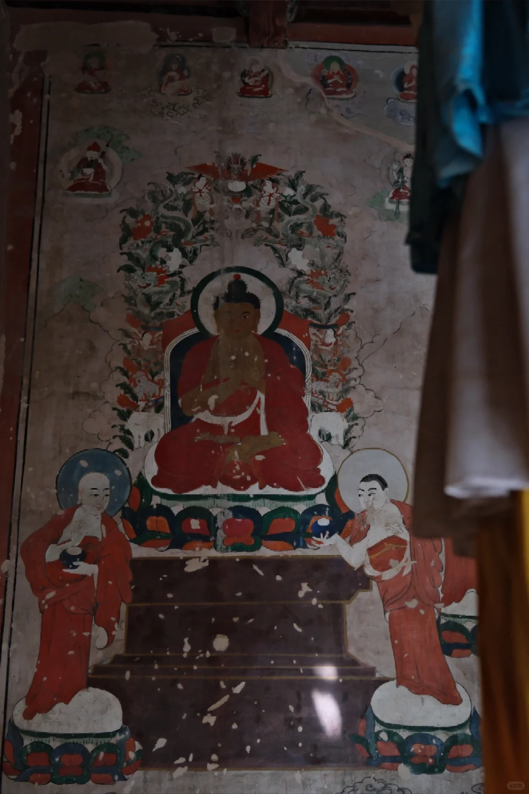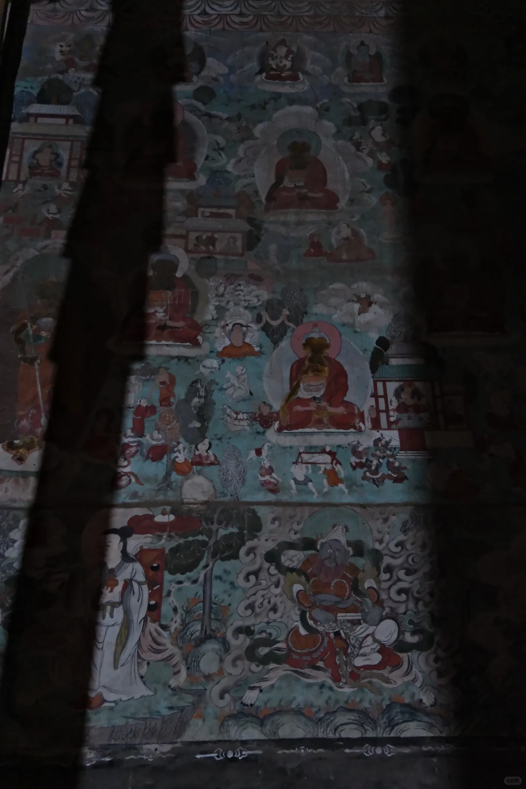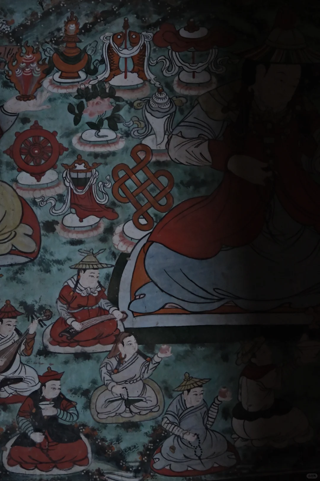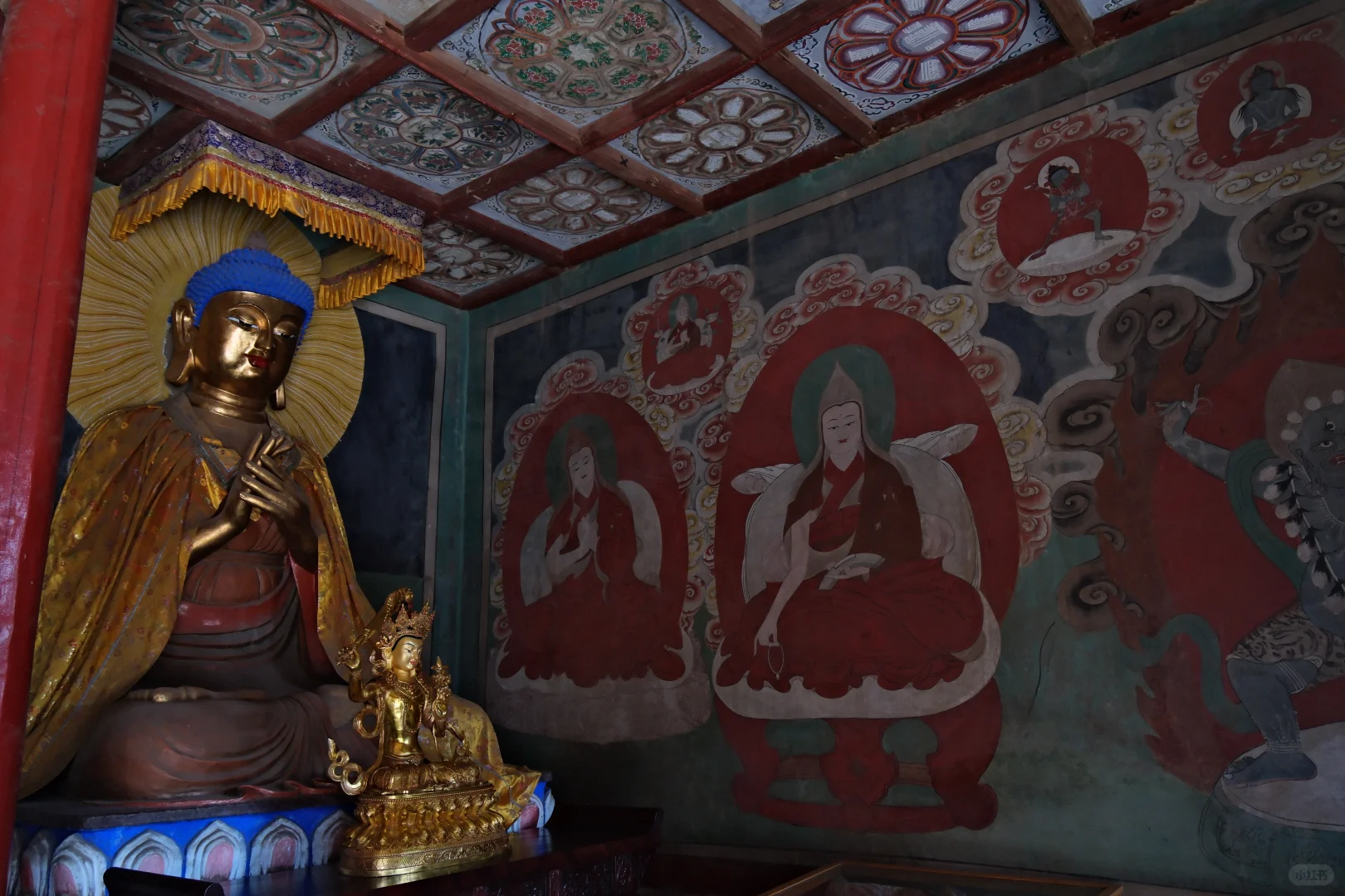 美岱召寺内保存有大量壁画,尤以大雄宝殿内描绘蒙古贵族拜佛的场面的壁画最为珍贵。
