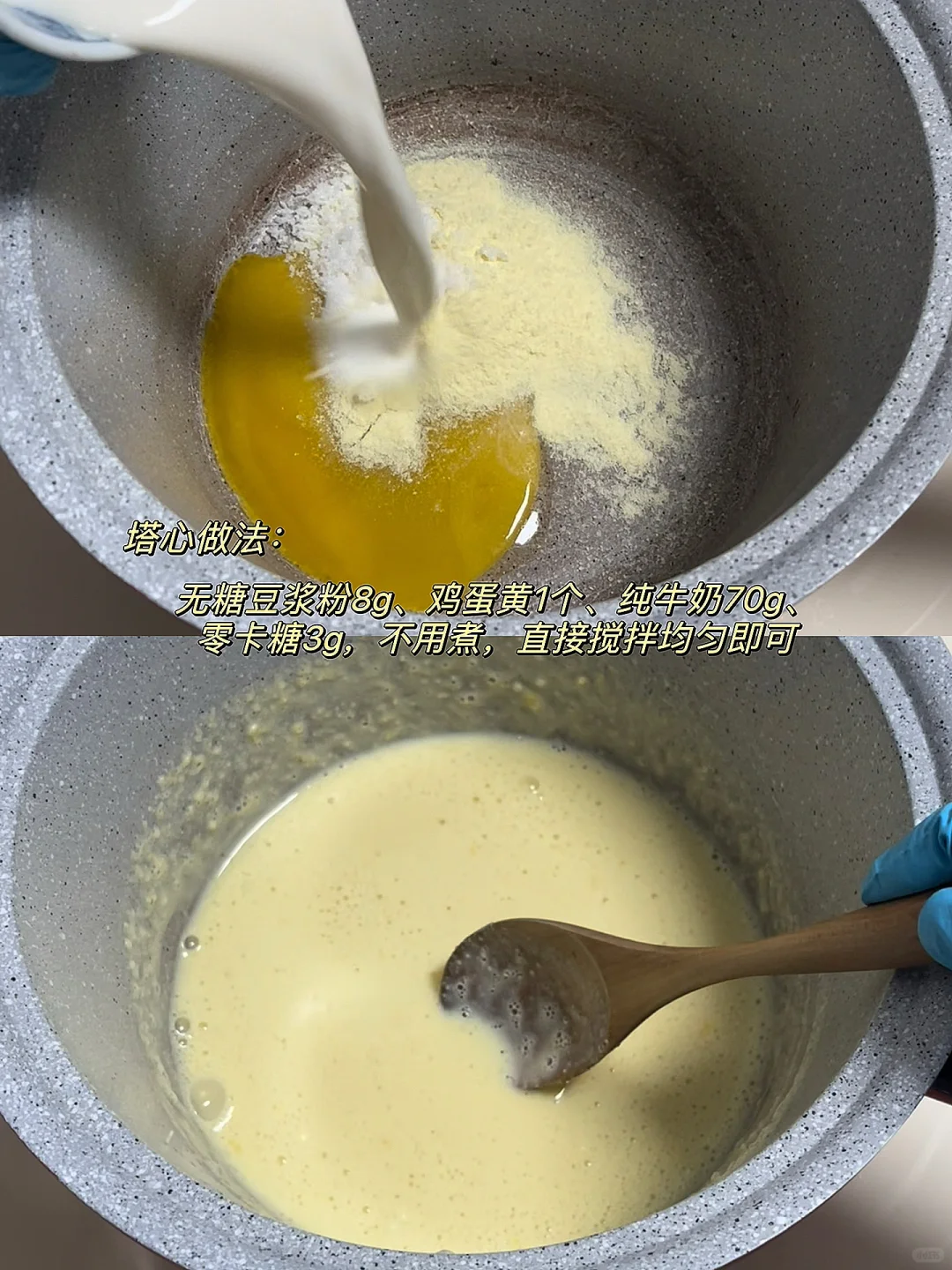 [向右R]蛋黄液材料:无糖豆浆粉8g、鸡蛋黄1个、纯牛奶70g、零卡糖3g。