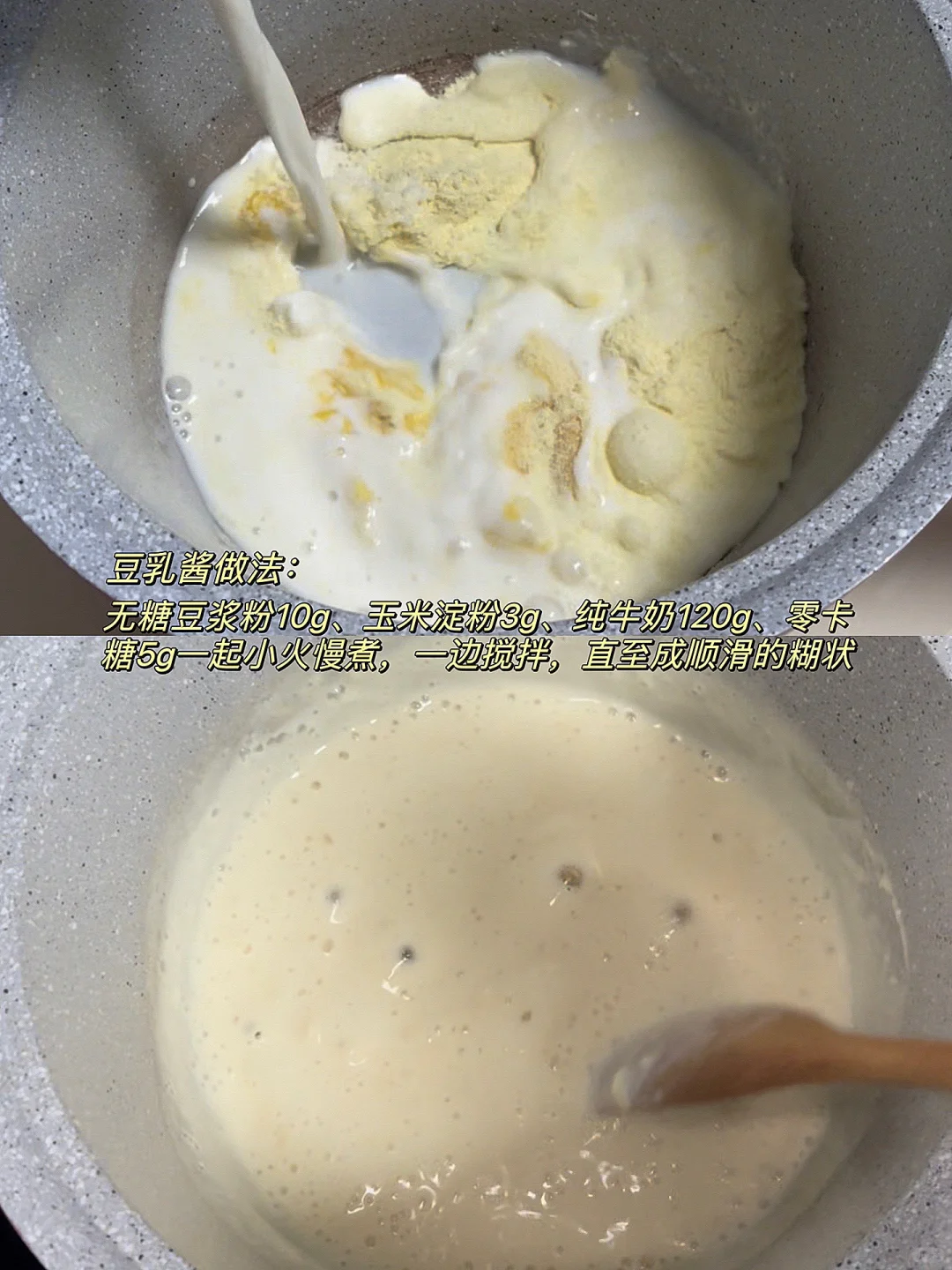 [向右R]豆浆乳材料:无糖豆浆粉10g、玉米淀粉3g、纯牛奶120g、零卡糖5g。