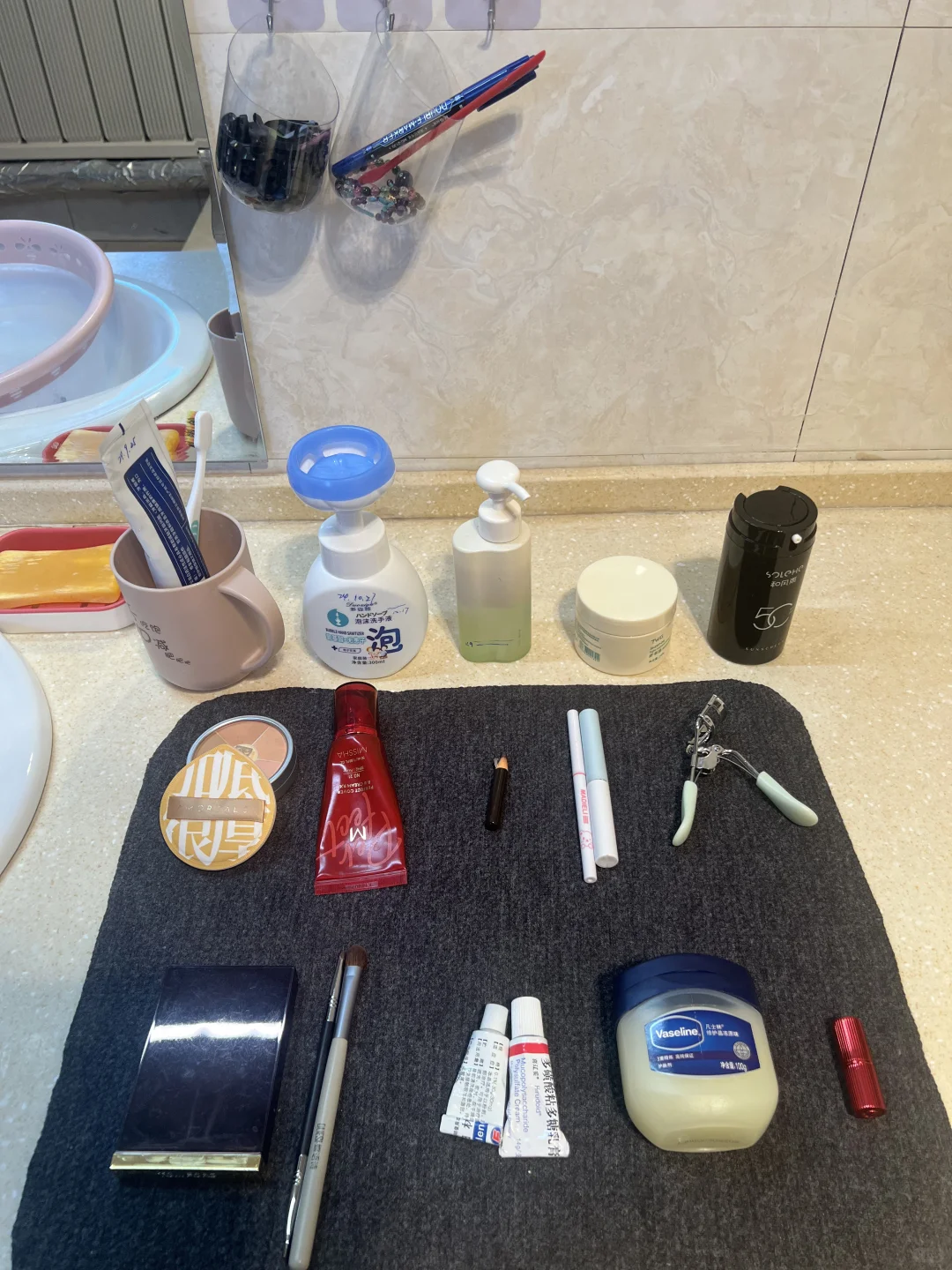 护肤化妆的相对数量多,如图二,这样放用起来方便,每种只有唯一的一样,用一样拿一样,用完放回原处,非常省时间。
