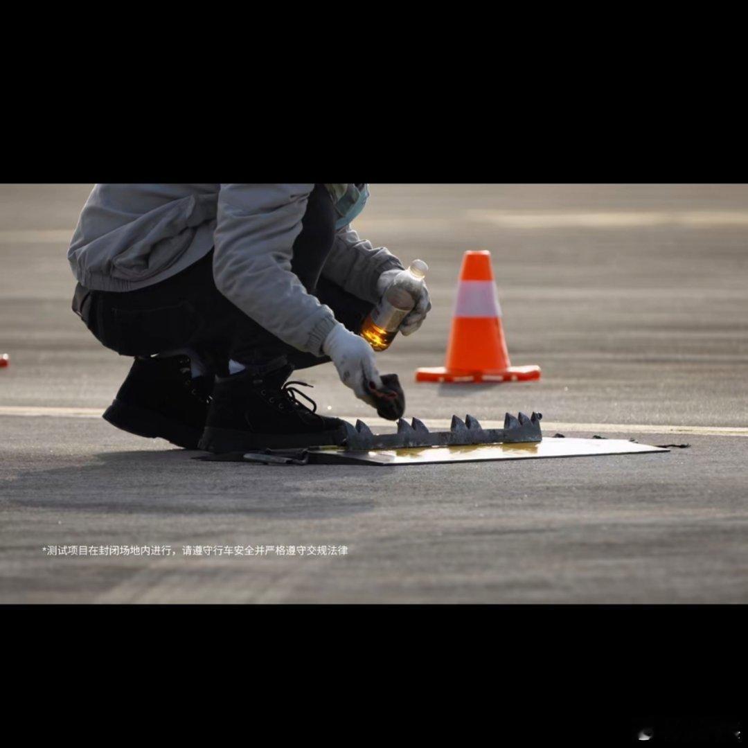 第二个镜头,工作人员在布置“地钉”,这个显然是用来破胎。