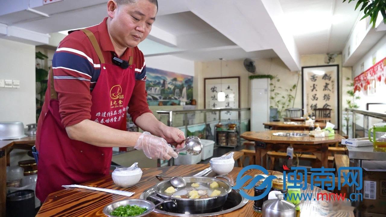 咯摊最重要的灵魂是汤头,讲究食材的品质新鲜,大筒骨加入罗汉肉炖煮,“现在生活水平提高了,高汤对很多人来说反倒是不健康的,我们的做法就是初心和良知。”吴振宇说自己没有绝招,他家的汤头清淡,清透的汤汁里,看得见大筒骨在锅中翻滚,发出咕噜咕噜的声音,厨房里弥漫着大骨的浓香。老板特地盛了一碗让我们品尝,滚烫的清汤清甜无比,有小时候的味道。为了保证食材的原汁原味,厨房里没有一粒鸡精,他认为,最原汁原味的食材要转化为最原汁原味的食物。
