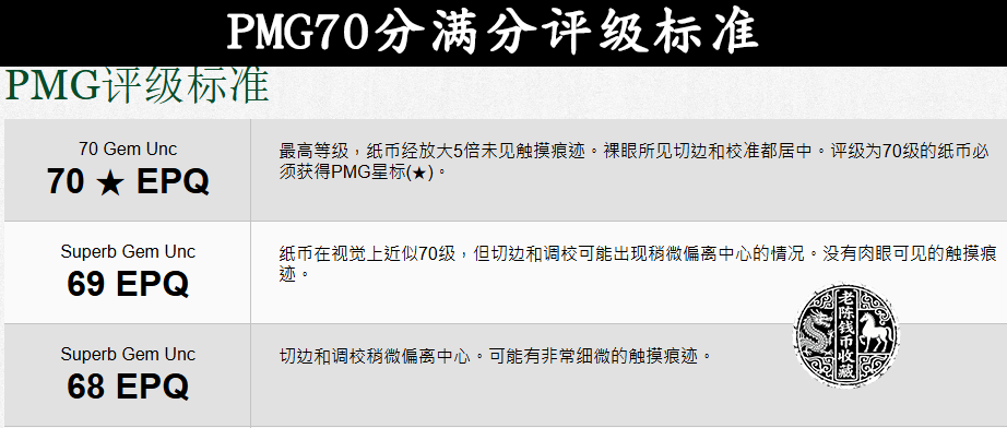 从上面的PMG公司的满分评级标准,可以发现,要达到70分,必须要印刷绝对居中,还要在纸币放大5倍情况下,也不能有触摸痕迹。要达到这个标准,就是从银行刚取出来的新纸币都不行,必须要一出厂,就被收藏,好好保存起来了。这种品相,要是出现在一张五版纸币身上的话,那五版纸币也能价值不菲。