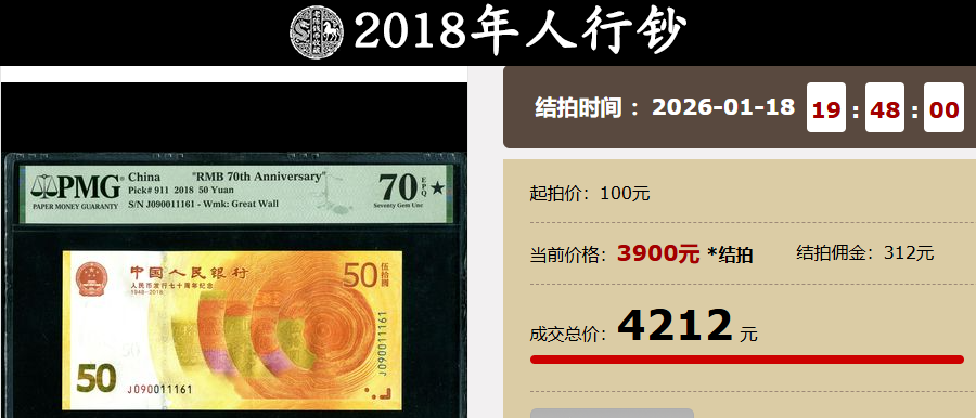 也就是上面这一张,在今年1月18号的现代钱币月拍卖会上,以4212元的价格被拍出的70钞。和它本身的50元面值对比来看,溢价就已经相当于4162元了。这张70钞的特别之处,主要集中在两点,老陈分别和大家好好说一说。其一,它的冠号是“J090011161”,数字部分只有0、1、6、9,这种组合就是典型的倒置号靓号。其二,它是一张PMG 70分满分带黑星的评级纸币,想达到这种品相,你们可能不知道有多难!