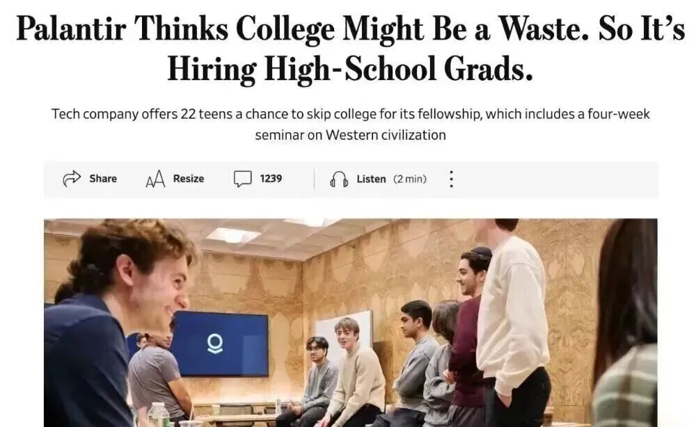 就像硅谷巨头Palantir在推出其选拔计划时直言不讳的那样:“上大学是一种浪费”。这句极具挑衅意味的话,直接将矛头对准了传统的学历评价体系。大厂们正在用真金白银和核心岗位的offer,打破“必须上了好大学才能有好工作”的社会共识。
