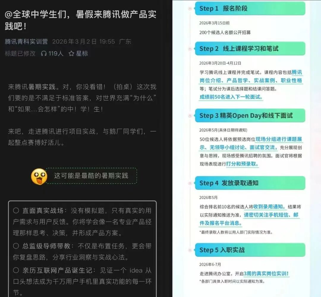 腾讯,通过“青科实训营”面向全球13-18岁的中学生招募暑期实践生。这些十几岁的孩子不仅能直接参与到金融科技、微信AI产品等真实项目的大战中,更有总监级导师手把手带教,表现优异者直接锁定腾讯人才库。
