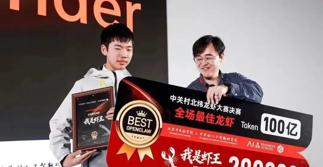 下图:姜睦然,初二学生,在中关村“虾王”创业大赛上,不仅拿下中关村“虾王”称号,还凭AI创业工具夺取冠军,获得20万奖金+100亿Token的算力资源。腾讯等大厂在中学里寻找的,正是这种人——不是“考满分的孩子”,而是能用技术思维去解决真实问题的孩子(图源:镇江信息学竞赛)