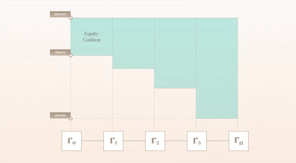在结构上,贷款发放时设置了保守的初始超额抵押,并采用激进的摊销计划,旨在让还款速度跑赢折旧曲线。最关键的是,协议摒弃了固定的算法估值模型,转而依赖第三方市场数据和估值专家来动态管理LTV,确保其基于当前真实市场状况维持在可接受的范围内。