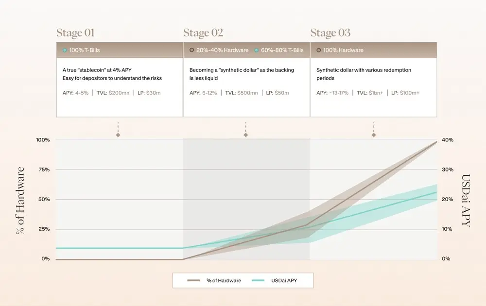 在协议最终成熟的状态下,其储备资产将主要由硬件支持的贷款构成。这将为sUSDai持有者带来高年化收益率(13%-17%+),但同时也意味着该代币将作为一种完全合成美元来运作,其赎回周期更长、更具可变性,并高度依赖QEV机制来管理流动性。