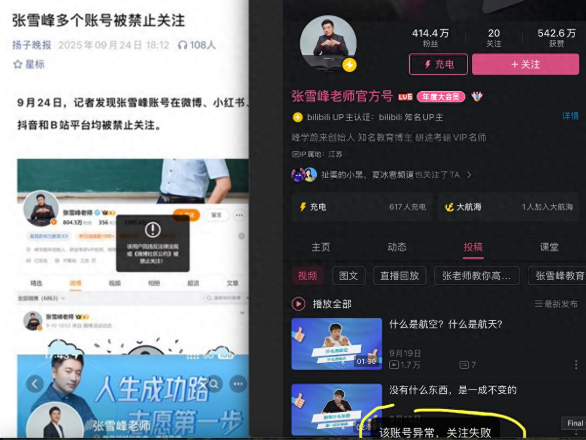 9月24日,张雪峰多平台账号同时被禁止关注,这些平台的粉丝总数超过6500万,有的明确标注“违反法律法规或《微博社区公约》”,有的仅显示“账号异常”。