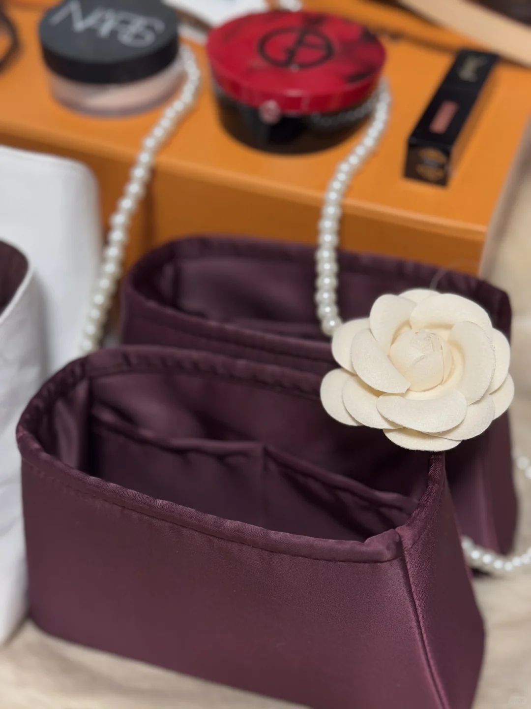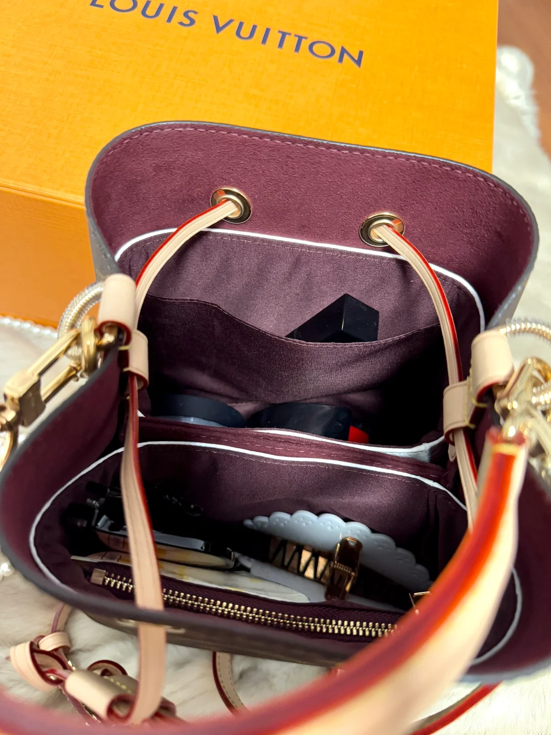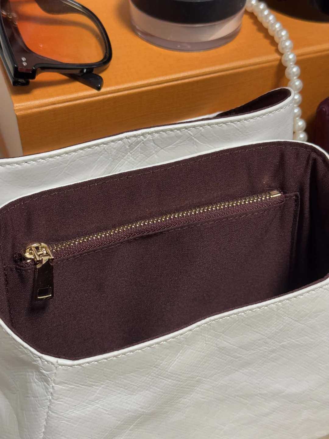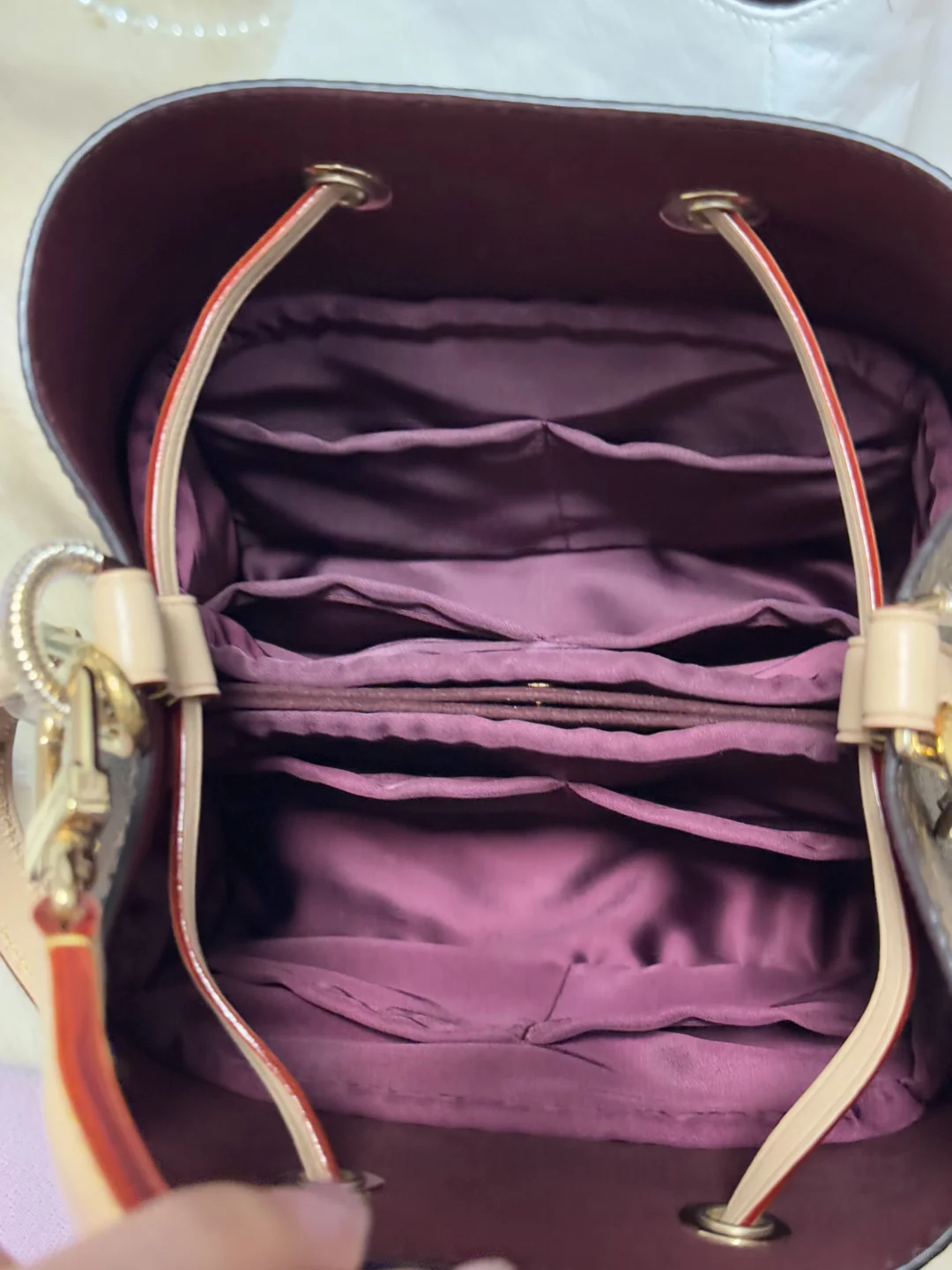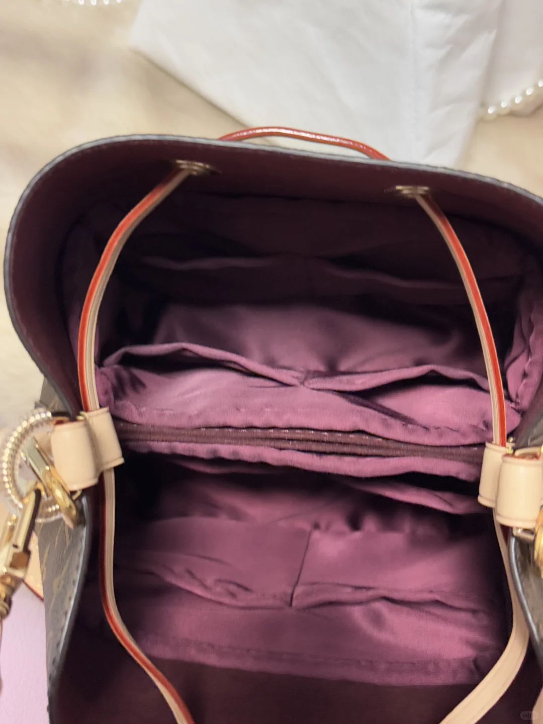 缺点:最大的缺点就是露出的杜邦纸白色边边!非常扎眼!这点处女座真的不能忍[捂脸R]杜邦纸材质很硬,棱角分明,放的东西多、重的话内胆可能会会损伤包包。内里没有光泽比较低调。另外隔层只有两个,小东西只能放在一起,找起来会比较麻烦