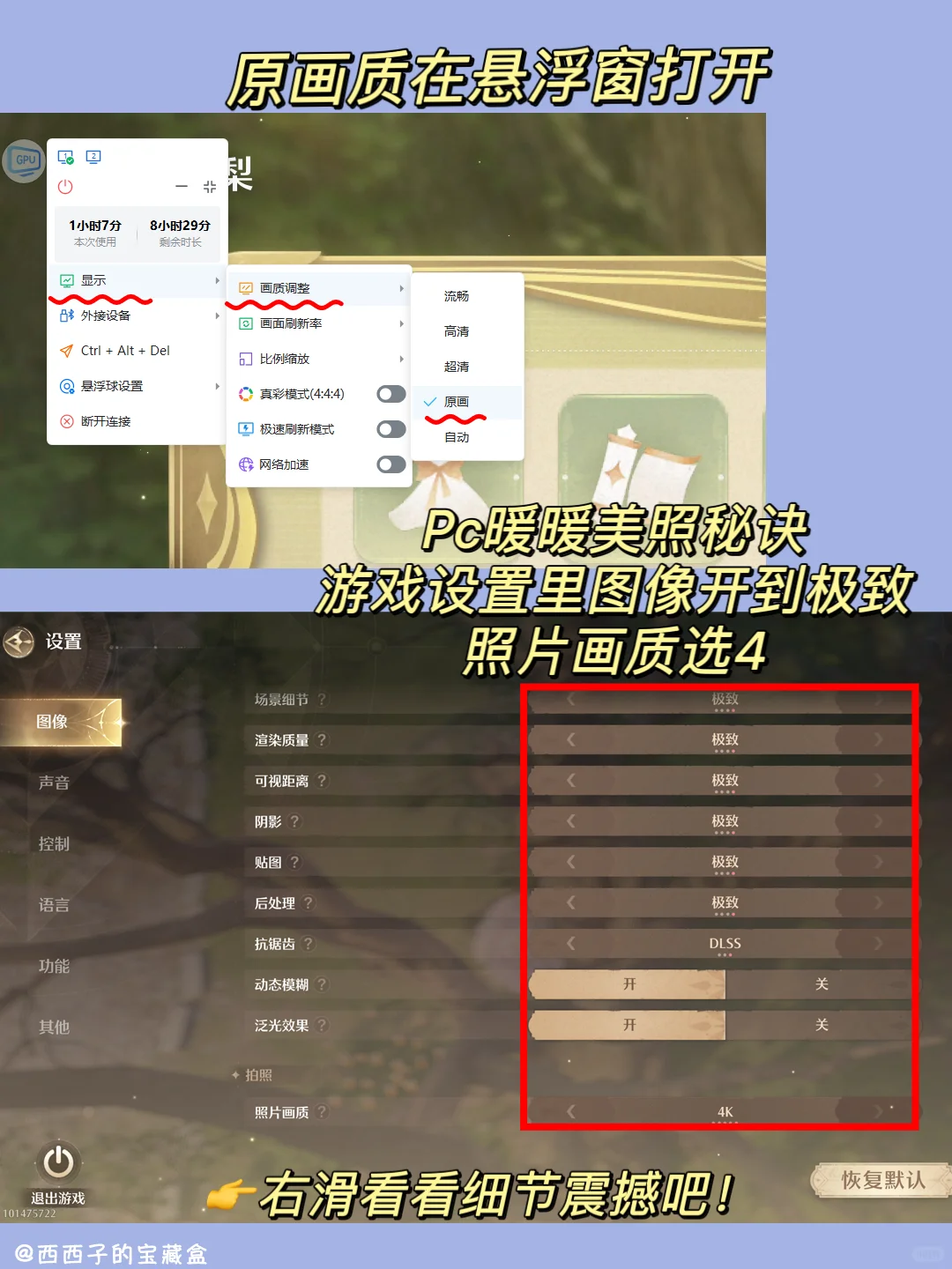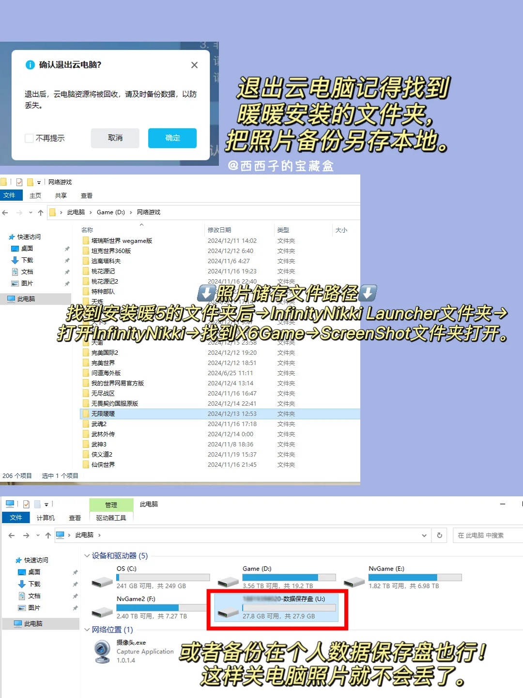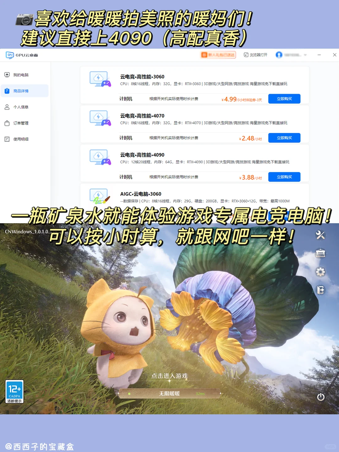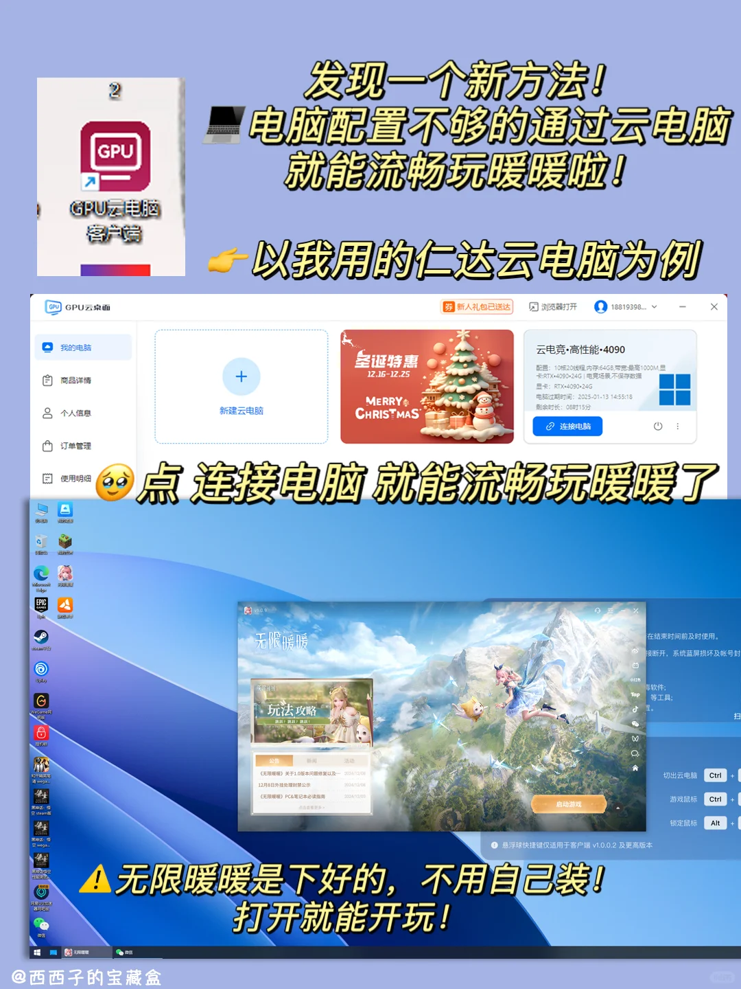 ☺️有救了姐妹们!不用花大价💰换新电脑了! 移动端暖画质不满意,电脑配置又不够玩不了暖暖或者玩暖暖很卡? ✅这个新方法就很适合你们!! 就是通过云电脑玩暖暖,类似线上网吧~ . 这里以仁达云电脑为例,他们有游戏专用的点对点云电竞,画质有原画,刷新率有4K144Hz,显卡有3060、4070、4090、我建议直接冲4090,(高配显卡暖暖值得拥有), 选了显卡就可以远程开机啦! 电脑桌面已有暖暖,不需要自己另外下,除了暖暖还有黑神话等热门游戏! 直接启动暖暖就可以开玩!整个过程就是这么简单! . 原本很卡的电脑间接变成了电竞电脑,画质高清,游戏也没什么延迟卡顿现象,可以连XBOX跟PS的手柄! 玩了PC端才知道大屏幕暖暖可以有多美!! 如果只是为了玩暖,那没必要换新电脑,🤔一天一包辣条很值啊! 📷特别是喜欢打卡美景给暖暖拍照的,想要拍出高清画质尊嘟很重要很显美丽! · ⚠️一些注意小Tiss: 1.暂时只支持win电脑系统。 2.给暖暖拍照的照片是存在云电脑的,关机就会自动还原系统,所以要记得保存备份到本机或者个人数据磁盘! 3.原画和屏幕刷新率需要在仁达云电脑的悬浮窗手动设置! 4.怎么找到PC端电脑的暖暖照片?先找到安装暖5的文件夹后→InfinityNikki Launcher文件夹→打开InfinityNikki→找到X6Game→ScreenShot文件夹打开。