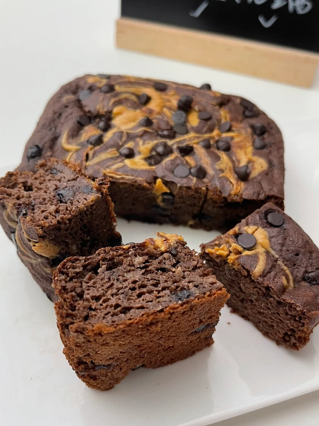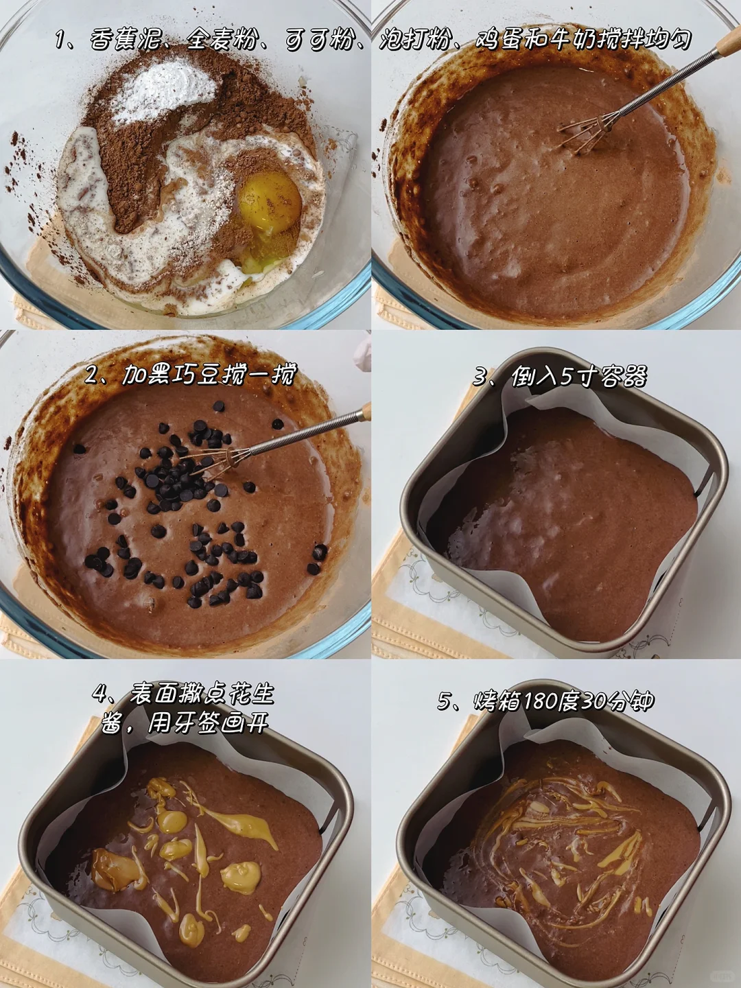 [向右R]食材:全麦粉40g、可可粉15g、泡打粉3g、纯牛奶70g、香蕉120g、花生酱一勺、耐高温黑巧克力豆适量