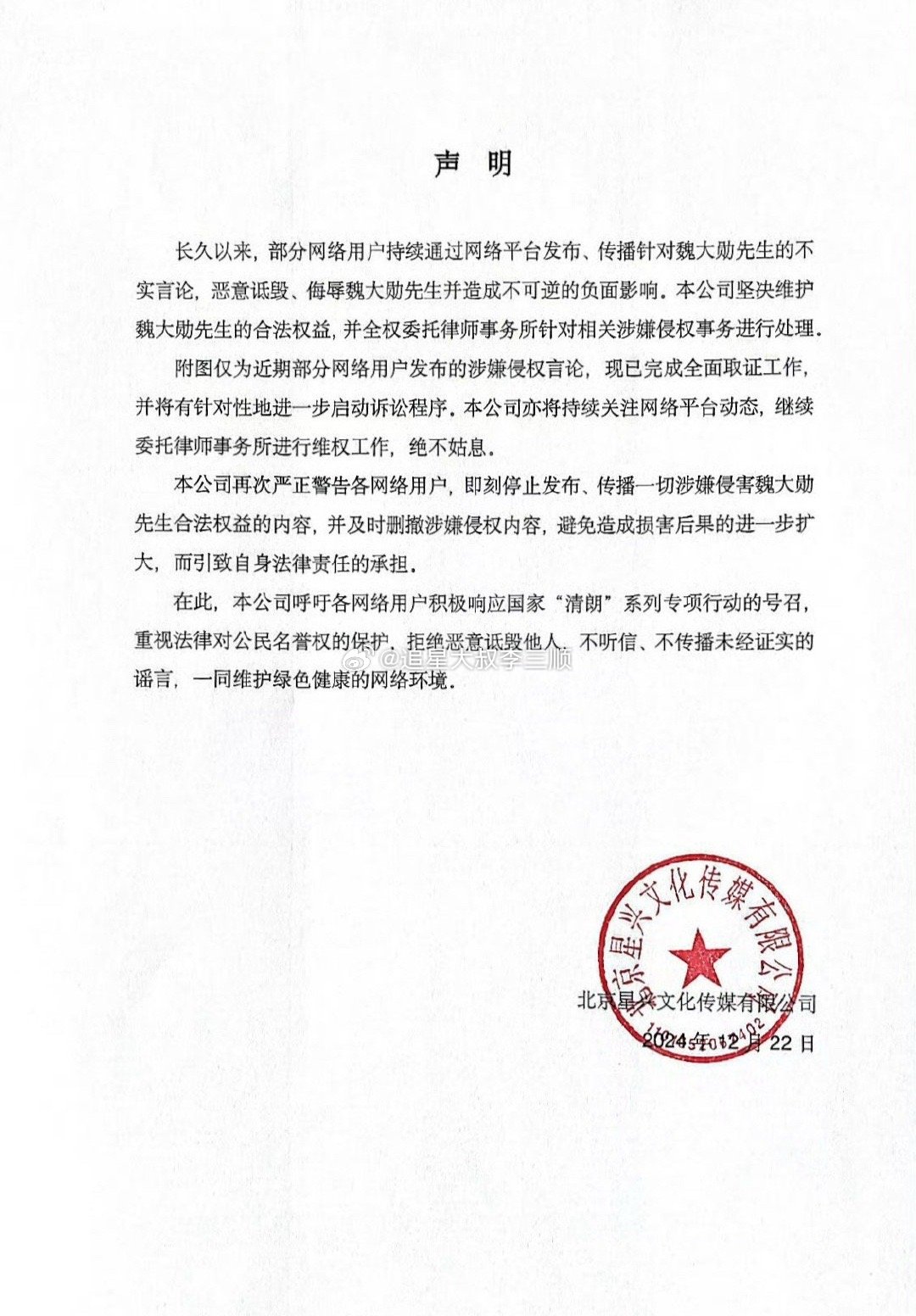 魏大勋工作室发布告黑声明 魏大勋工作室告黑声明,支持维权!