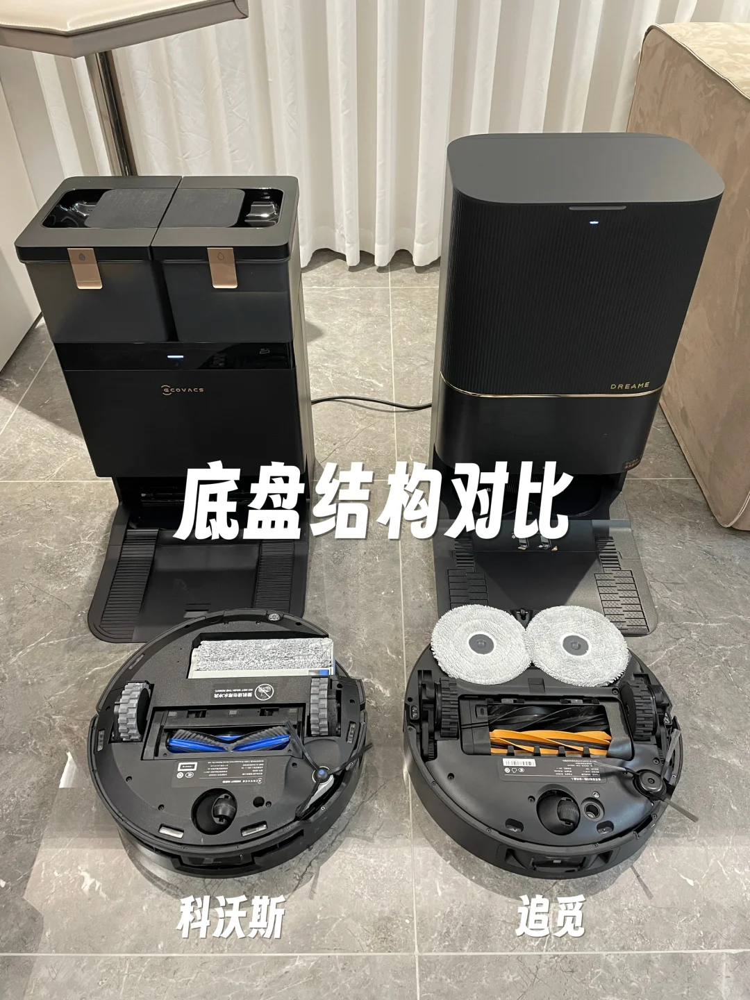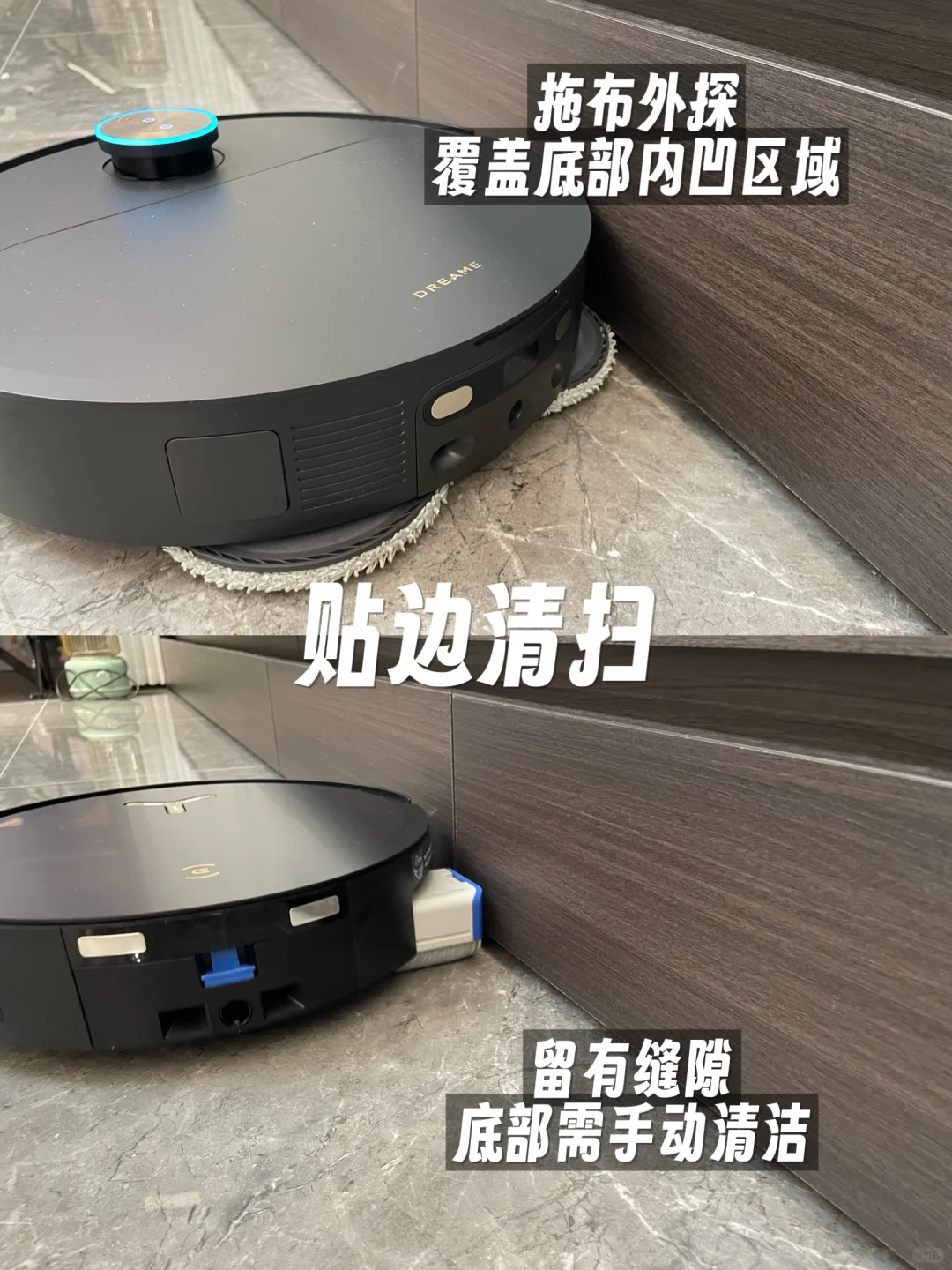 追觅的底部是双圆盘拖布加仿生机械臂,科沃斯采用的是伸缩滚刷拖布;扫地功能遇到直线贴边和直角时两者都能完全扫到,但是使用拖地功能时,直角顶端都存在一小部分死角。另外,我家电视柜的抽屉面板下方以及柜门下方的内凹区域,科沃斯的伸缩拖布也没法伸进去,追觅的圆盘拖布反而能探进去覆盖到。