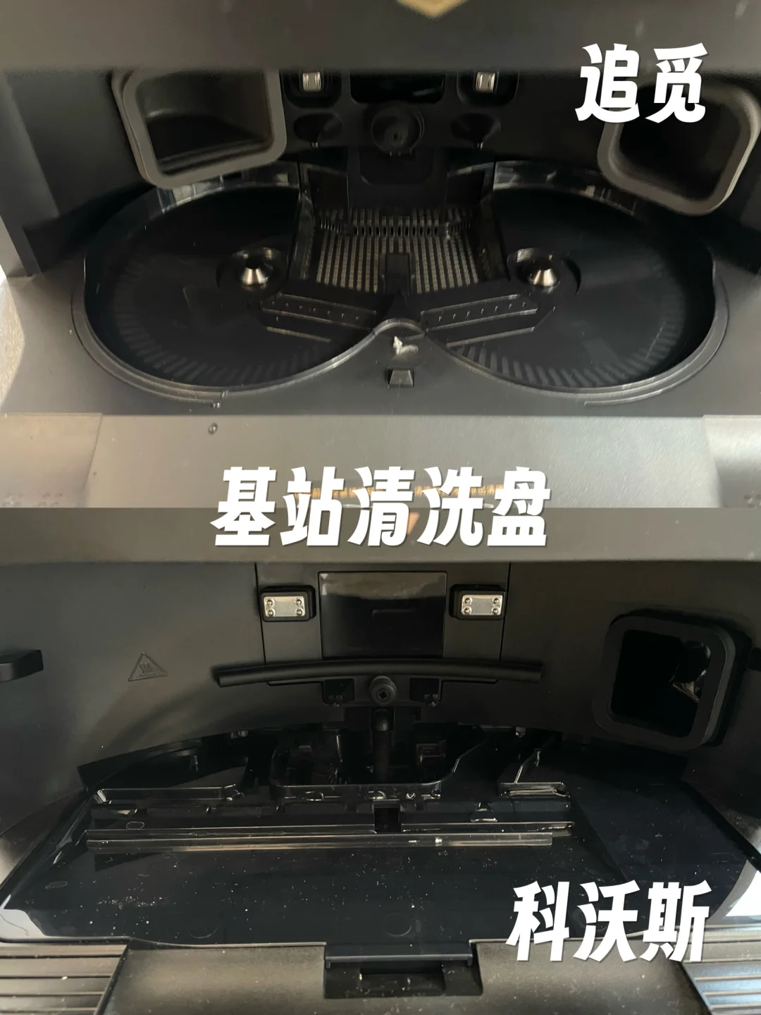 两者都有自动集尘、自动烘洗拖布的功能,确实都很方便。追觅采用了最新的一体式清洗盘设计,不需要手动拆卸刮洗盘,20个孔全方位喷洗拖布,洗干净之后再搭配马桶虹吸原理,把基站的污水全部被抽走。也大大降低了长期使用情况下基站发臭的概率。