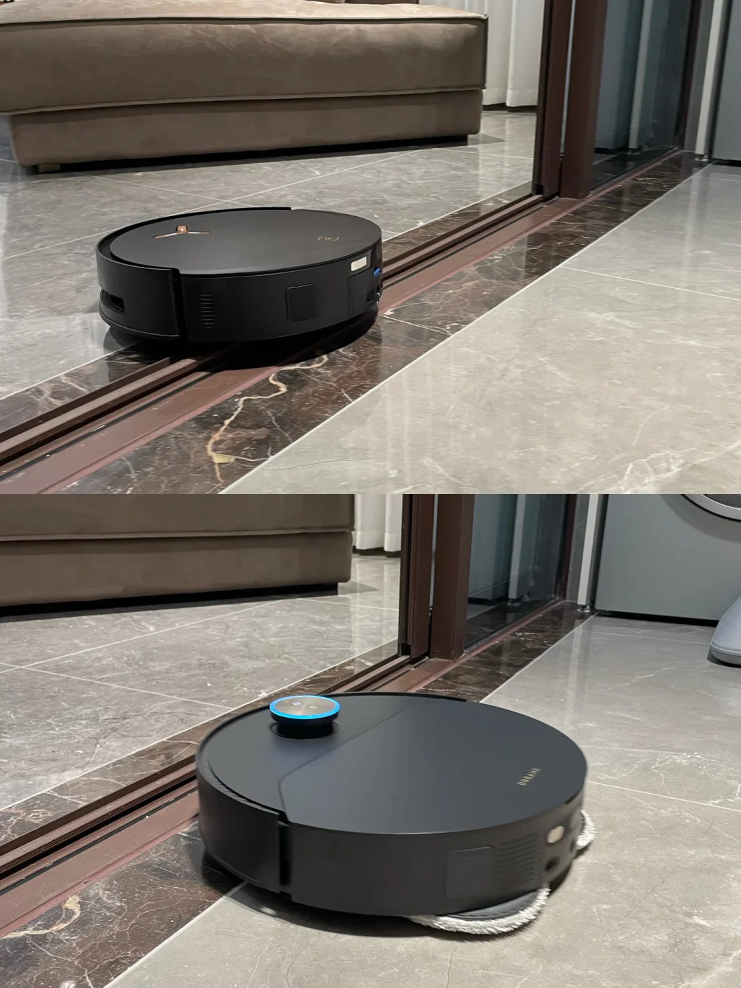 模拟了一下家里小孩玩具乱扔的情况,不得不说说在普通避障上,两者做的都挺智能了,布置的障碍物都能轻松绕开。同时也测试了一下,跨门槛的能力,我家蕞高门槛就是阳台移门处了,两位老哥也都是轻松越过。