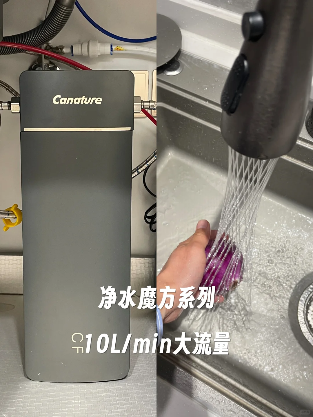 ☑️厨洗用水大龙头-魔方净水器:PP+ACF复合滤芯,能有效过滤泥沙、颗粒物、余氯、固体物等洗菜洗水果吃起来也更放心了出水量10L/min和普通自来水流速基本没差别这个出水量连接洗碗机供水都没问题而且体机小巧省空间,厨下、洗手台下都适用。