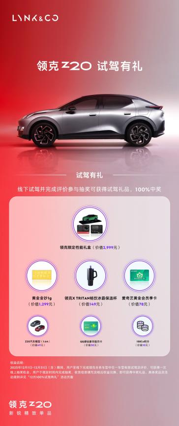 曜红版专属福利更具个性化亮点,12月前200名下订并提车的用户,可获赠价值666元的“非必要不合作”联名电气灯。成功参与试驾还有好礼相送,现场有领克限定性能礼盒、畅饮冰霸保温杯、影视平台会员等奖品等你来赢,让用户在深度体验车辆的同时,收获额外惊喜。