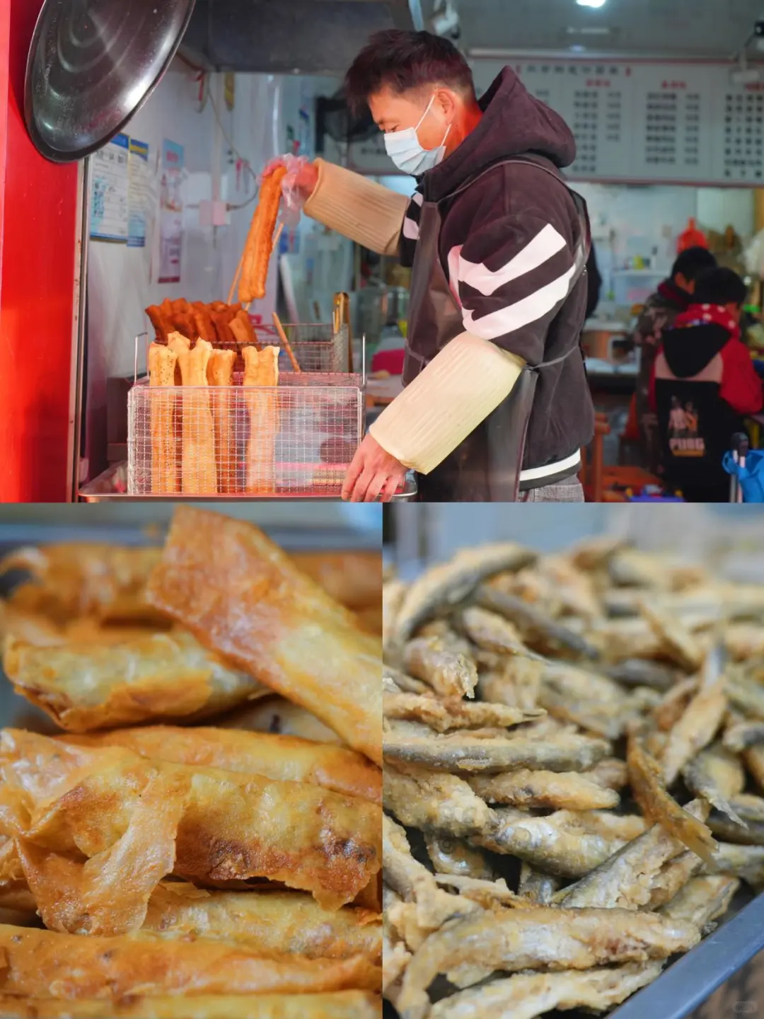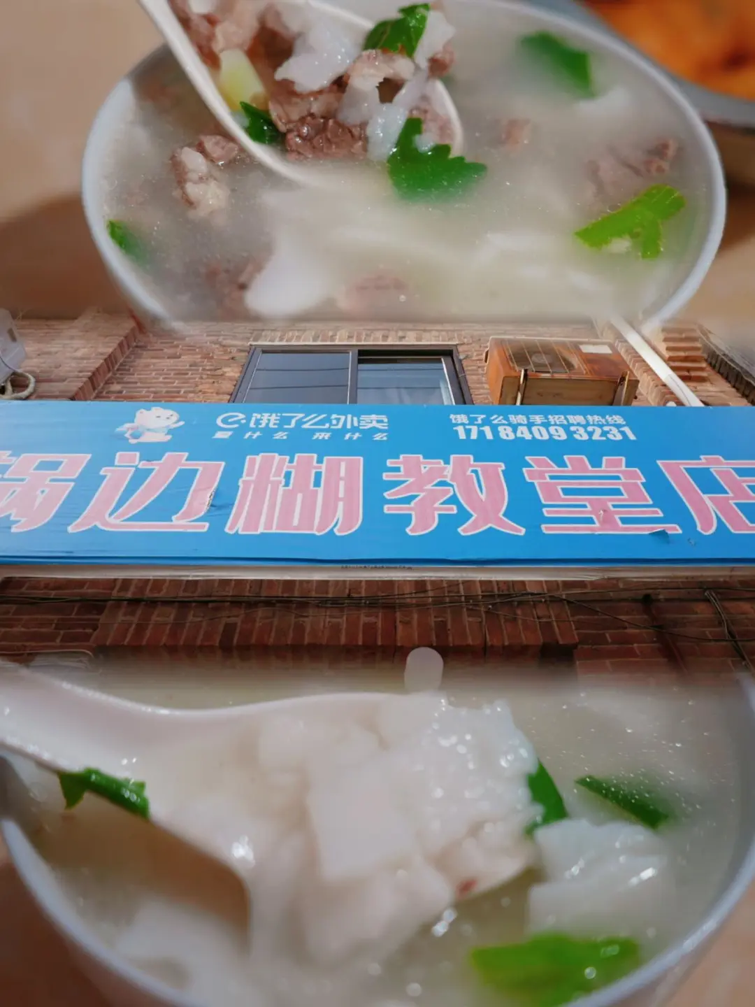 ✅锅边糊教堂店:锅边糊+炸物,是古田人早餐的标配!汤底是大肠小肠煮的,一人一碗锅边围着桌子坐下,一口糊汤一口葱油饼或油条,开启平淡幸福的一天。