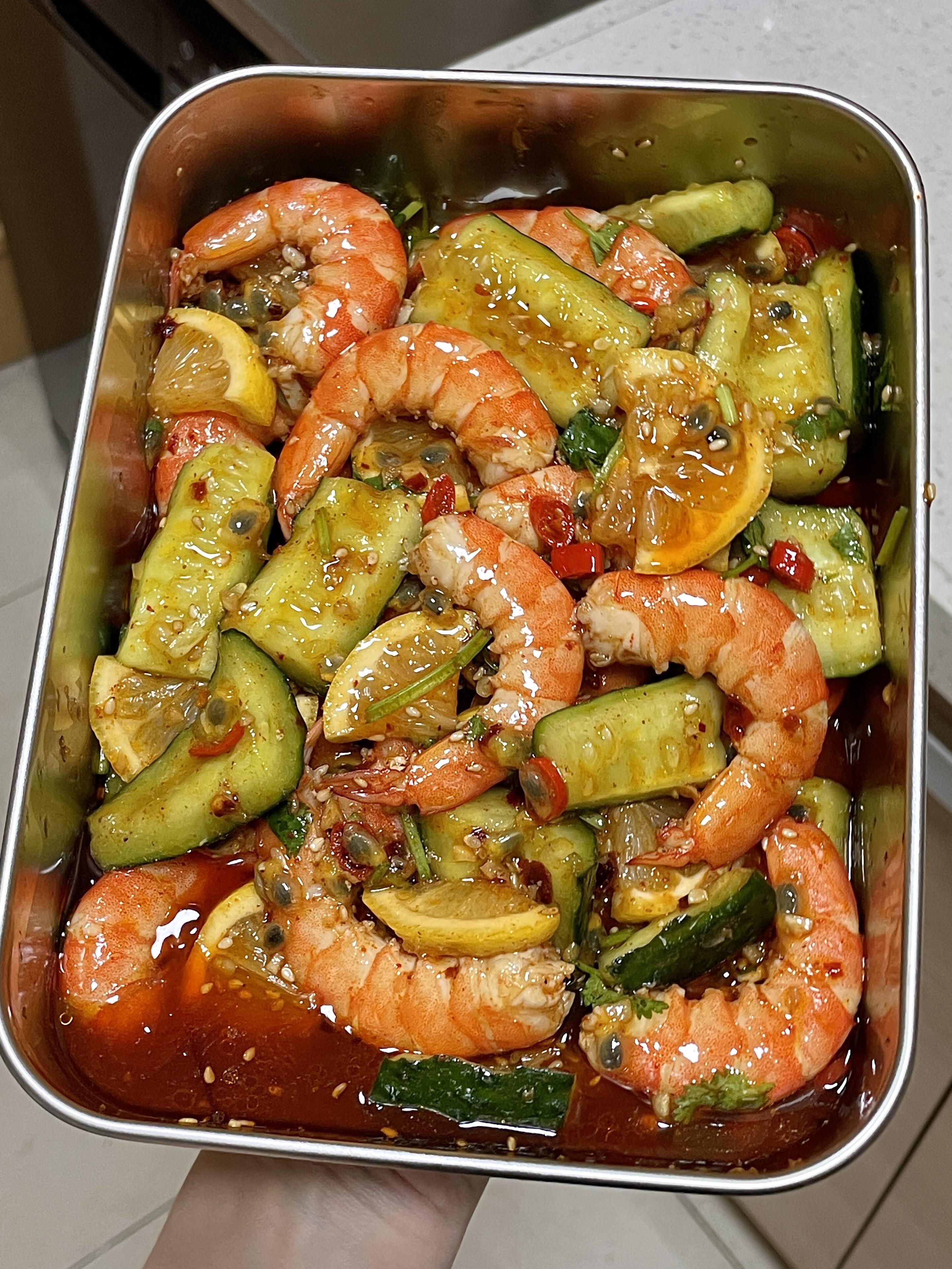 装盘上桌,红亮的虾仁、翠绿的黄瓜、金黄的百香果籽、嫩黄的柠檬片,色彩缤纷,光看着就让人食欲大开。夹一只虾仁送进嘴里—先是酸,百香果和柠檬的酸清爽明亮,像一阵凉风吹过舌尖;接着是辣,小米辣和辣椒粉的辣温和持久,慢慢爬上味蕾。虾仁弹牙,咬开有汁水,带着本身的鲜甜。黄瓜脆爽,咯吱咯吱的,正好中和了酸辣。最妙的是百香果籽,咬破的时候噗的一声,那股独特的香气在嘴里散开,整个人都跟着清爽起来。