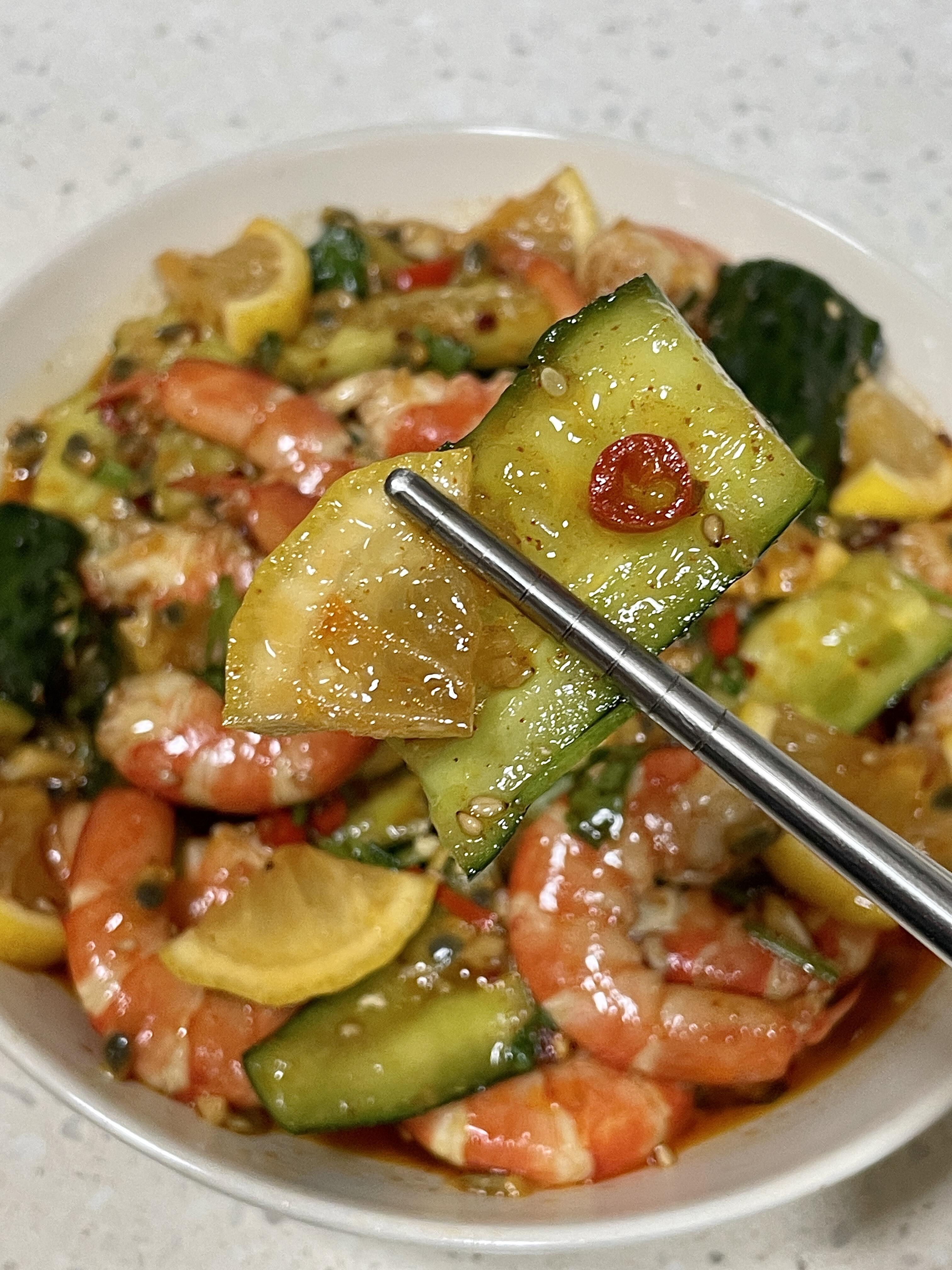 那天下午做了这道菜,端到阳台上吃。太阳快要落山了,风吹进来带着一点点凉意。一口虾,一口黄瓜,再喝一口冰啤酒,整个人都舒坦了。夏天的闷热好像也被这一口酸辣冲散了。