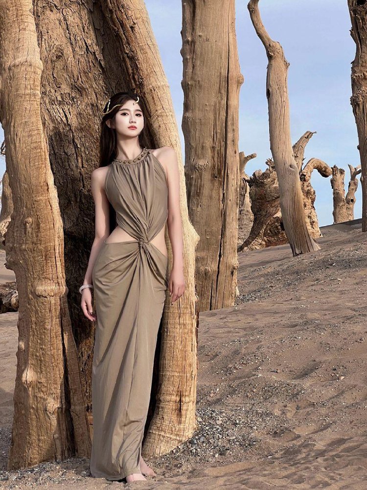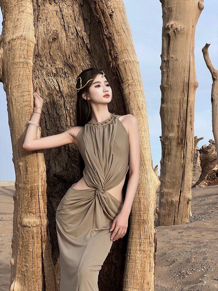 生日宴会重工镂空挂脖长裙年会订婚礼服高端轻奢小众无袖连衣裙女