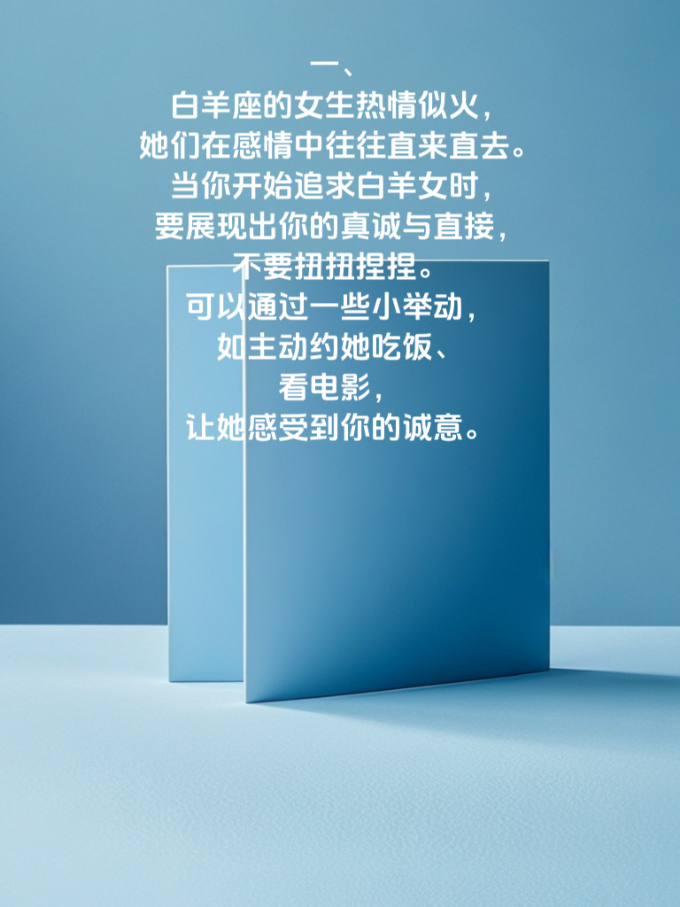 一、白羊座的女生热情似火,她们在感情中往往直来直去。当你开始追求白羊女时,要展现出你的真诚与直接,不要扭扭捏捏。可以通过一些小举动,如主动约她吃饭、看电影,让她感受到你的诚意。 二、白羊女喜欢有活力、有激情的男生。在与她们相处时,要保持积极向上的态度,一起参加一些有趣的活动,让她看到你的活力与魅力。同时,要尊重她的想法和决定,不要试图控制她。 三、当白羊女对你心动时,她会变得很主动。此时,你要及时回应她的感情,让她感受到你的在乎。不要让她等待太久,因为白羊女的耐心是有限的。用你的真心去打动她,让她成为你生命中的那个特别的人。