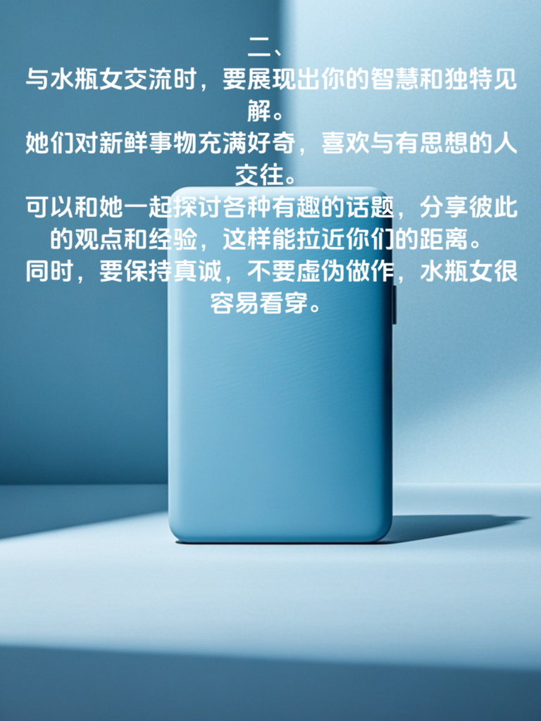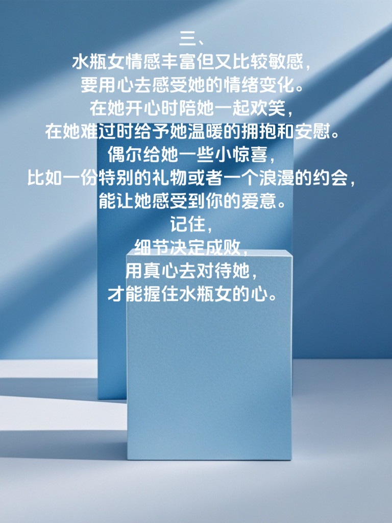 一、水瓶女通常富有独立精神和创新思维,她们不喜欢被束缚。要握住水瓶女的心,首先要给予她足够的空间,让她能自由地追求自己的兴趣和梦想。不要试图去控制她,而是默默地支持她,在她需要的时候伸出援手。 二、与水瓶女交流时,要展现出你的智慧和独特见解。她们对新鲜事物充满好奇,喜欢与有思想的人交往。可以和她一起探讨各种有趣的话题,分享彼此的观点和经验,这样能拉近你们的距离。同时,要保持真诚,不要虚伪做作,水瓶女很容易看穿。 三、水瓶女情感丰富但又比较敏感,要用心去感受她的情绪变化。在她开心时陪她一起欢笑,在她难过时给予她温暖的拥抱和安慰。偶尔给她一些小惊喜,比如一份特别的礼物或者一个浪漫的约会,能让她感受到你的爱意。记住,细节决定成败,用真心去对待她,才能握住水瓶女的心。