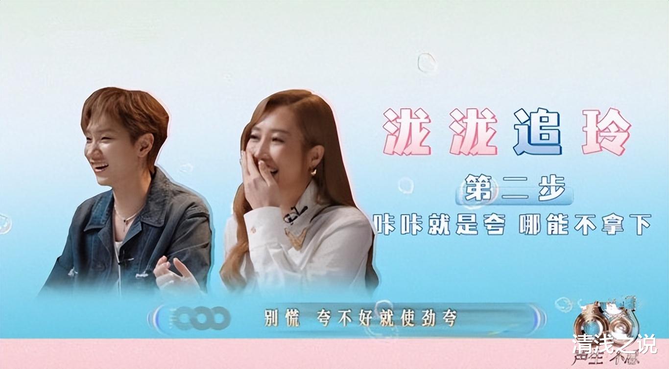 泷泷追玲第二步“咔咔就是夸,哪能不拿下。”汪苏泷说如果没有A-Lin黄丽玲,整个华语乐坛就黯然失色(仅代表汪苏泷个人观点)。A-Lin黄丽玲不信,问上一次他合作的女歌手(希林娜依·高)他也是这样回答的吗?汪苏泷说没有,因为希林娜依·高比较年轻。这不明摆着说A-Lin黄丽玲老嘛。既然夸不好那就使劲夸。彩排时他说要换衣服,不然配不起美女搭档,还夸A-Lin黄丽玲怎么唱都好听,答应为A-Lin黄丽玲写歌。