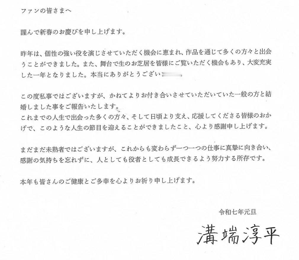 标题为 “致各位粉丝”,报告中写道:“此次虽是私人之事,但我已与此前一直交往的一位普通女性结婚了。” 并附上亲笔签名称:“多亏了此前人生中遇到的众多人士,以及平日里支持、鼓励我的各位,我才能迎来这样的人生重要节点。” 率先将这份喜悦传达给了粉丝们。