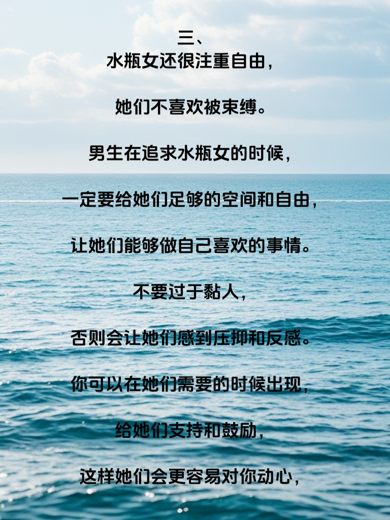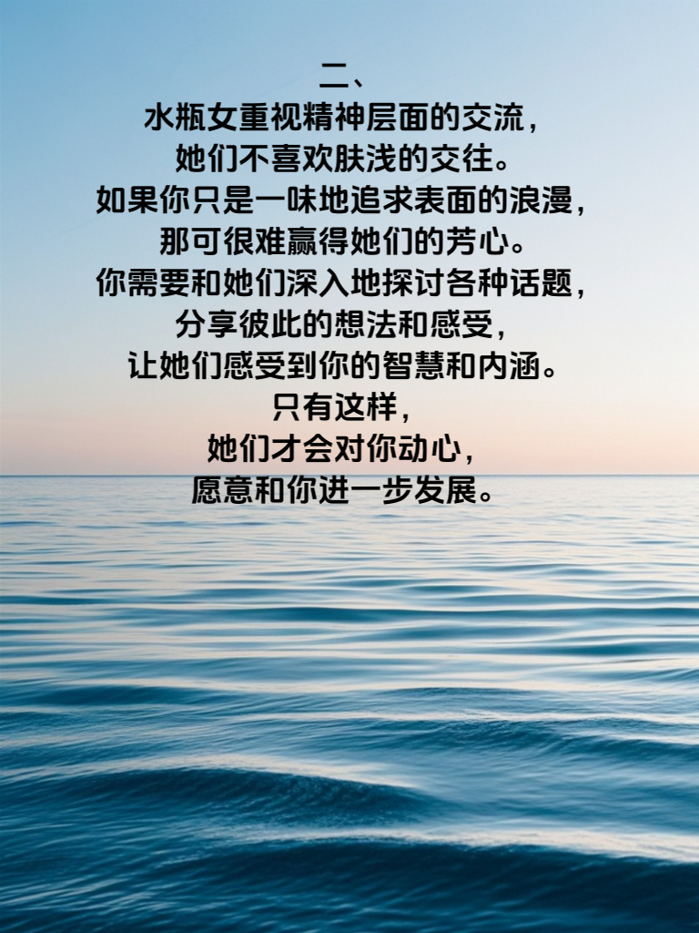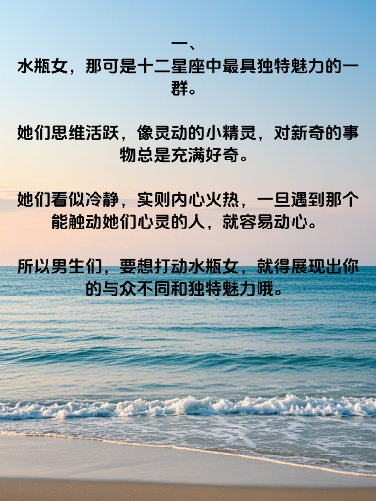 一、水瓶女,那可是十二星座中最具独特魅力的一群。她们思维活跃,像灵动的小精灵,对新奇的事物总是充满好奇。她们看似冷静,实则内心火热,一旦遇到那个能触动她们心灵的人,就容易动心。所以男生们,要想打动水瓶女,就得展现出你的与众不同和独特魅力哦。 二、水瓶女重视精神层面的交流,她们不喜欢肤浅的交往。如果你只是一味地追求表面的浪漫,那可很难赢得她们的芳心。你需要和她们深入地探讨各种话题,分享彼此的想法和感受,让她们感受到你的智慧和内涵。只有这样,她们才会对你动心,愿意和你进一步发展。 三、水瓶女还很注重自由,她们不喜欢被束缚。男生在追求水瓶女的时候,一定要给她们足够的空间和自由,让她们能够做自己喜欢的事情。不要过于黏人,否则会让她们感到压抑和反感。你可以在她们需要的时候出现,给她们支持和鼓励,这样她们会更容易对你动心,和你建立起深厚的感情。